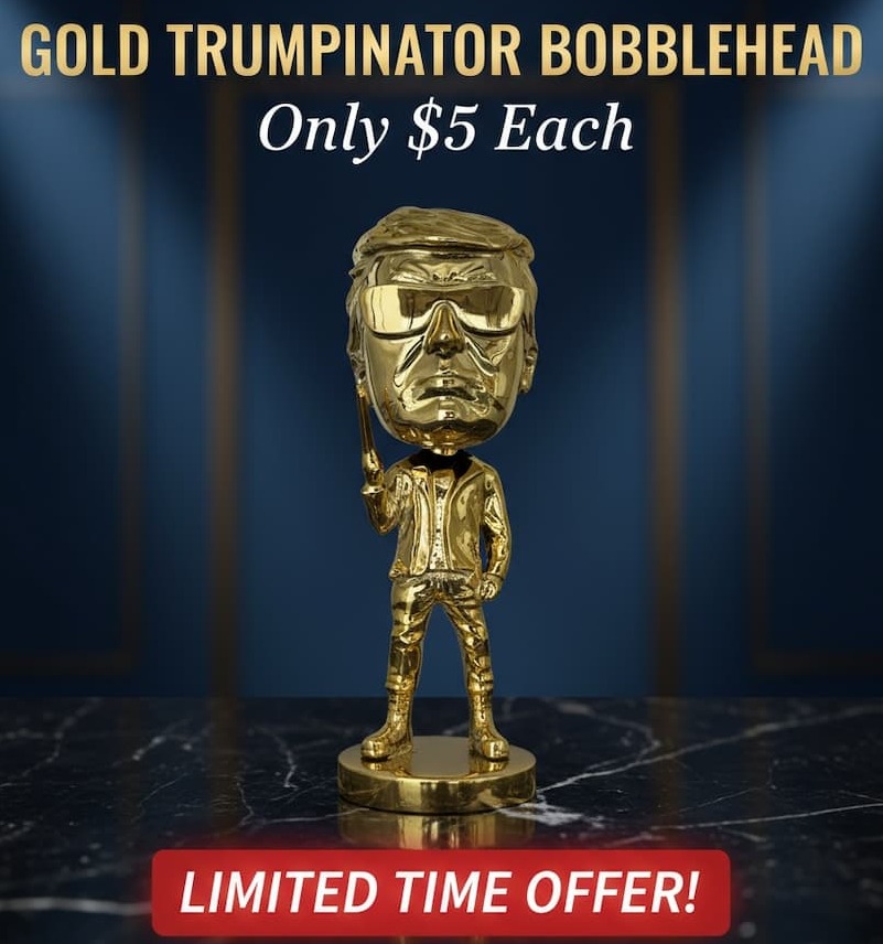 We're giving you the opportunity to own one of the only 10,000 units we made for our mini-sized gold trumpinator for only $4.99! This is a bobblehead and it's a cute 4 inches tall!
