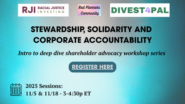 This free, virtual workshop series is designed for financial professionals and members of donor networks invested in Big Tech who are ready to take action with their capital. It's a joint collaboration between Rad Planners, Racial Justice Investing, and Resource Generation's working group, Divest4Pal. The first date is 11/5. We know we need more mass-based money strategies to drive social change. This series will start with the conceptual and focus on the practical, answering the questions: Why use shareholder advocacy? and How do I utilize shareholder advocacy tools to effect change? You can learn more and register here. |