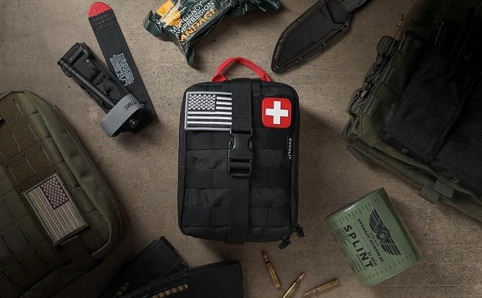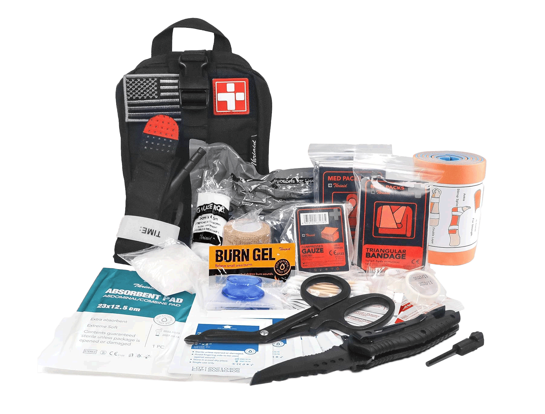 Quick-access tourniquet and compression bandages for effective bleeding control.