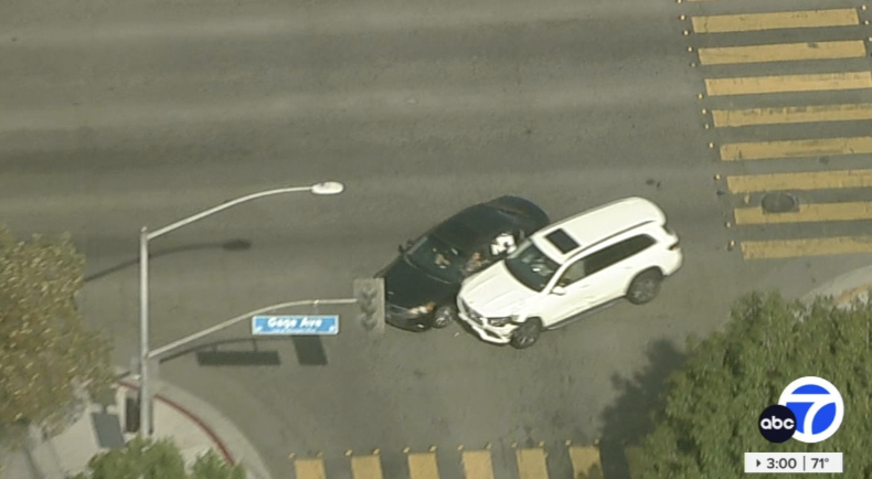 A robbery suspect who led police on an erratic and dangerous chase was taken into custody after he crashed into an innocent family's sedan at a Huntington Park intersection Tuesday morning. The pursuit started around 11:13 a.m. The suspect is suspected of being involved in a robbery or burglary in downtown Los Angeles, police said. However, the Los Angeles Police Department didn't provide additional details about the crime. AIR7 was over the chase as the white SUV sped down Gage Avenue, blowing through intersections and driving into oncoming traffic - all at speeds of up to 80 mph. The suspect hit several other cars before he sideswiped the innocent driver in a Honda sedan at Malabar Street. Both cars came to a stop against a fence near Middleton Street Elementary School. Thankfully, the innocent bystanders aboard the sedan were all able to walk away from the incident without serious injuries. Ethan Donovan, 13, said he and his family were heading home when the crash happened.