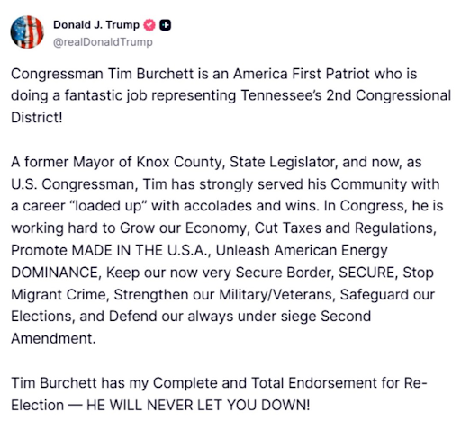 JOHN, Β Itβs the biggest endorsement there is in this businessβand Iβm truly honored to have it. But even more than that, Iβm proud to call President Trump a friend.