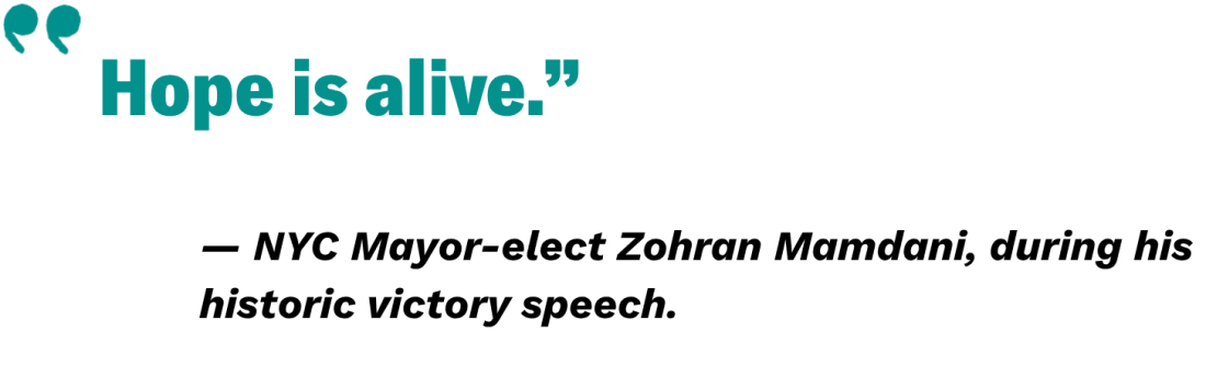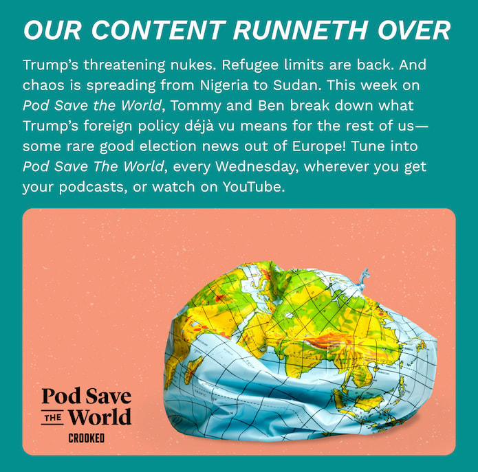 Our pals over at Vote Save America had this to say: “Lib out today. Share fire content to your Instagram stories. Text your ‘not political’ friends and let them know how hype you are. There’s more work ahead, but today is all about victory lapping.” WHAT ELSE?Hamas returned the body of 19-year-old Itay Chen, the last Israeli-American hostage, more than two years after he was kidnapped. Israel also returned the bodies of 15 Palestinians to the Gaza Strip, as part of the ongoing ceasefire deal. At least nine people died after a UPS plane carrying 38,000 gallons of fuel crashed in Kentucky on Tuesday, officials said. Videos of the accident show a massive fireball and plumes of smoke. A federal judge ordered Department of Justice prosecutors to hand over more records related to their dubious criminal probe of former FBI Director James Comey, expressing concern that Trump’s team wanted to “indict first” and investigate afterwards. Trump seems likely to get his peace prize soon… just not the Nobel. FIFA announced that its creating a peace prize of its own. “In an increasingly unsettled and divided world, it’s fundamental to recognize the outstanding contribution of those who work hard to end conflicts and bring people together in a spirit of peace,” said FIFA President Gianni Infantino, who is suuuuper close with Trump. Tech freak Elon Musk teased the possibility of testing a flying Tesla “before the end of the year,” while speaking on Joe Rogan’s podcast. Awesome, instead of bursting into flames on the street, they’ll now burst into flames after crashing through my 14th floor apartment window. Japan deployed its military to counter an uptick in bear attacks across the country. More than 100 people have been injured and 12 killed by bears since April, according to government stats. The bears aren’t only a danger to people: They’re so hungry that they’re frustrating farmers. “My heart is broken,” one orchard operator said, after bears ate more than 200 of his apples. LIGHT AT THE END OF THE EMAIL…Donald Trump seems fed up with his own top aides. “I want my cabinet to behave like [Chinese leader Xi Jinping’s staff],” Trump told senators this morning. He was clearly joking… but there seemed to be an ounce of truth. “JD doesn’t behave like that,” Trump said. “JD butts into conversations.” The private sector added 42,000 new jobs in October, the first increase since July, according to ADP. GOP senators showed a rare sign of unity against Trump, bashing one of his nominees for the Pentagon policy office during a public hearing. Senators accused Austin Dahmer, who has been serving in an acting role, of stonewalling lawmakers seeking information. “I can’t even get a response,” said Sen. Dan Sullivan (R-Alaska). “And we’re on your team.” An astute X user pointed out that Rama Duwaji, Zohran Mamdani’s wife, wore a fashionable top designed by Palestinian-Jordanian designer Zeid Hijazi after being crowned the city’s next first lady last night. While we’re on the subject, here’s an adorable pic of Zohran handing Rama, who happens to be an artist, flowers backstage at a rally in June. What a power couple. On the fashion note, beloved TV personality Ms. Rachel honored children in Gaza by wearing a dress embroidered with their artwork to the Glamour Women of the Year Awards 2025 last night. “These kids are just amazing; they’re so thoughtful and so brilliant. I know all their names and stories,” Ms. Rachel said. “I’m so proud of you. I’m so proud to wear your artwork.” Switzerland is calling on UNESCO to include yodeling (yodel-ay-hee-hoo!!!) as part of the country’s cultural heritage. “In Switzerland we have four languages, but I think really we have five languages. We have a fifth: The yodel,” one Swiss professor said. Okay, got it, but could you say that to me in Yodel, please? You’re currently a free subscriber to Crooked Media. For the full experience, upgrade your subscription. |