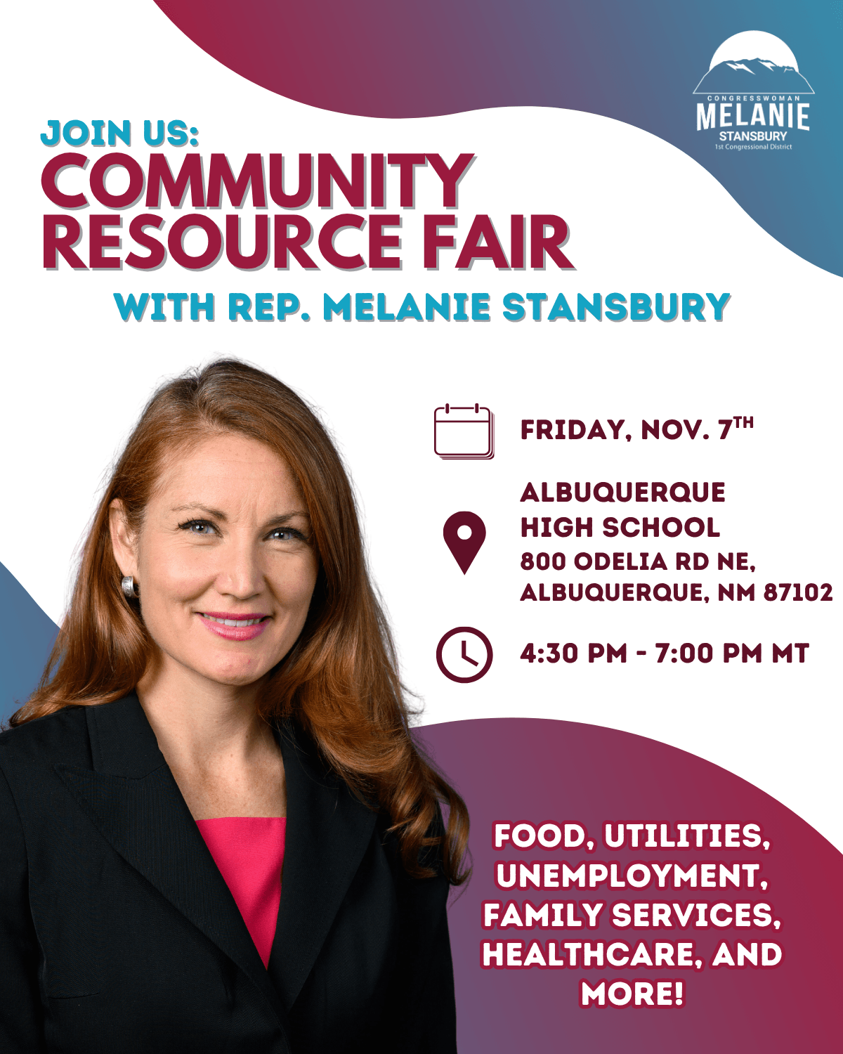 My office will be hosting a community resource fair this Friday, November 7th, with state and local agencies, non-profits, utilities, and food banks! Please stop by if you’ve been affected by the shutdown, or if you're just looking for general guidance! November 7th: 4:30 - 7:00 pm MT Albuquerque High School 800 Odelia Rd NE, Albuquerque, NM 87102 Below you'll find a full list of organizations. Food: - Meals on Wheels New Mexico