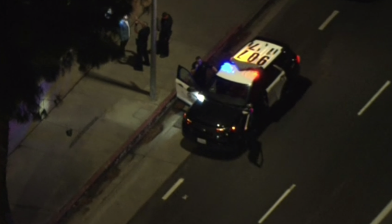 An alleged hit-and-run suspect fled from the scene of a crash involving a Los Angeles Police Department cruiser in Porter Ranch on Wednesday night. It happened at around 10:40 p.m. near Chatsworth Street and Wilbur Avenue, LAPD officials told CBS Los Angeles. They say that a white or silver sedan was driving southbound on Wilbur and hit the ajar door of the officer's patrol car. LAPD officials said that the officer suffered minor injuries in the crash but that they were expected to be okay. Police were in the area after learning of a different crash in the area, which involved a car that had somehow ended up on the sidewalk. With SkyCal on the scene, officers were spotted administering a sobriety test to someone. No further details were provided.