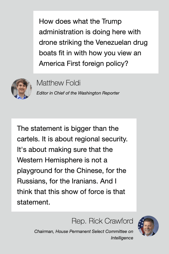 If you have a tip you would like to anonymously submit, please use our tip form — your anonymity is guaranteed! INTERVIEW: House Intel Chairman Rick Crawford explains why Trump, Hegseth, and Rubio striking Venezuelan drug boats is America Firstby Matthew Foldi Secretary of War Pete Hegseth and Secretary of State Marco Rubio came to the Hill this week to brief top lawmakers in both parties about the drone strikes that the Trump administration is carrying out against Venezuelan drug boats. Rep. Rick Crawford (R., Ark.), the Chairman of the House Permanent Select Committee on Intelligence, was in the room, and in an interview with the Washington Reporter, he explained what he learned — without leaking classified information, as former-Rep. Adam Schiff was wont to do — as well as how these strikes fit in with an America First foreign policy. The drug boats, Crawford argued, “threaten[] us geopolitically in the region, but also threaten[] the homeland with regard to the introduction of narcotics and human trafficking and other criminal enterprises associated with narco trafficking, drug trafficking organizations.” INTERVIEW: CUFI Action Fund’s Sandra Hagee Parker explains why supporting Israel is grounded in Christianityby the Washington Reporter The Washington Reporter has been following the debate on the right over U.S. support for Israel. Our editorial position is unequivocal: Israel is an ally, Israel’s enemies are our enemies, and a strong U.S.-Israel relationship is in our national security interest. We decided to ask our friends at Christians United for Israel (CUFI), a deeply-respected group for Christians who believe God’s Abrahamic covenant endures, to explain the theological argument for why believers should back a strong U.S.-Israel relationship. We appreciate CUFI and Sandra Hagee Parker’s thoughtful answers below. Washington Reporter: Can you tell us about your role and how you ended up at CUFI’s Action Fund? Sandra Hagee Parker CUFI began in 2006, and with its exponential growth, it became clear that we needed a full-time team in Washington, D.C. to ensure that our members and their issues were well represented year-round, at both the state and federal levels. We achieved that goal in 2015 when we opened the CUFI Action Fund. Heard on the Hill