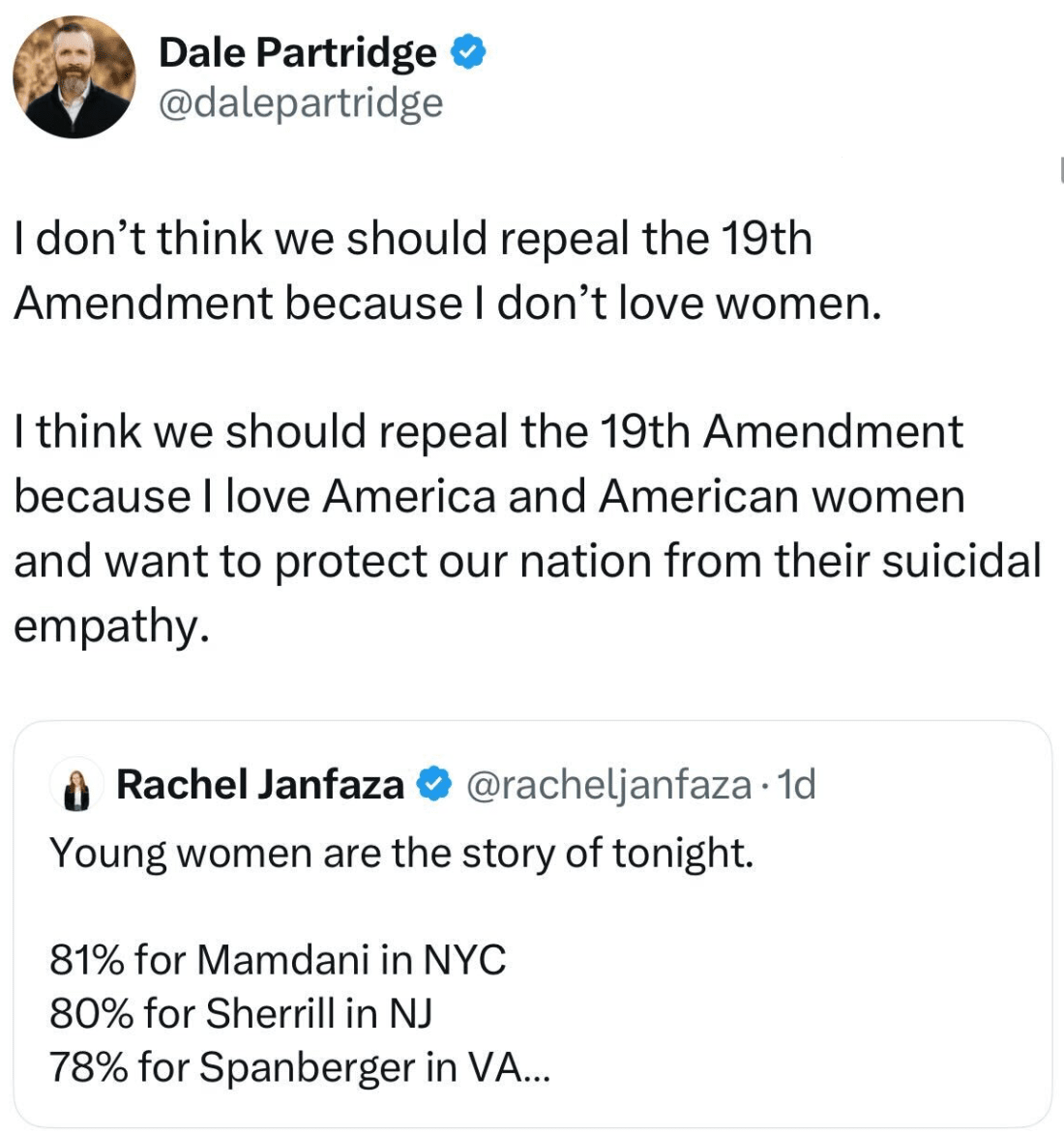 News like this is why we built The Feed: to analyze the politics, expose underreported trends, and back the creators who aren’t waiting for permission to tell the story. If that sounds like your kind of journalism, back it here: Democrats absolutely crushed on Election Day 2025, winning every major race and most of the minor ones, too. It’s a desperately needed injection of hope and newfound confidence for Democrats plus an opportunity to celebrate for the first time since that dark day last November — and there are a lot of lessons to be learned from last night’s overwhelming sweep. Time to log on. Lesson 1: It’s The Economy, StupidFrankly, it’s hard to overstate how incredibly fucking stupid Republicans are. Trump won last November largely because people were mad that President Biden’s economic recovery was taking too long and Harris didn’t do enough to distance herself from the policies that people blamed for their economic woes. All Trump had to do was sit back and play golf while Biden’s efforts to combat inflation continued to do their job. Instead, he decided to start implementing a completely senseless 18th-century protectionist tariff regime that sent the economy into a tailspin and sent prices skyrocketing. Combine that with laying off half of northern Virginia and denying millions of people their SNAP benefits because you want their healthcare premiums to skyrocket, and it’s easy to see why people were angry. In New York City, socialist Zohran Mamdani ran a campaign that was laser-focused on kitchen-table economics — he once famously responded to a question about his opinion on the Kendrick Lamar / Drake rap beef by talking about affordability — and was not only able to survive relentless and deeply hysterical smear campaigns by terrified billionaires by staying on message, he inspired the biggest voter turnout in decades with more than twice the voters from four years ago. In New Jersey and Virginia, both Mikie Sherill and Abigail Spanberger ran dual-focused campaigns centered on affordability and opposing Trump, each winning by 13 and 15 percent respectively in states that Kamala Harris won by less the six points. Democrats hadn’t won local-level statewide races in Georgia for TWO DECADES. On Tuesday, they won two races by 20+ points, propelled by frustration with the GOP and sky-high electricity prices. Those two issues are the key to building a winning coalition for the future. That’s because… Trump and his band of sadistic freaks have WAY overplayed their handThe president can pass off the blame as much as he wants — which of course, he began doing immediately by posting that Republicans were losing BECAUSE he wasn’t on the ticket — but the numbers show that people are furious at Donald Trump. A Fox News poll of Mikie Sherill voters found that 71% of them said they were motivated to vote to oppose Donald Trump. His disapproval rating is at an all-time high, at 63%, and that’s not changing anytime soon. In New Jersey and Virginia, Democratic candidates won over 90% of Trump disapprovers. Inexplicably, Trump and his team decided that a 1.5% or so popular vote victory margin in an election that was largely about economics meant they had a national mandate to impose Full Hitlerism With Ku Klux Karacteristics, and began doing so with terrifying speed and horrifying cruelty. It’s pretty clear now that at least some people voted for Trump because they believed he could wave a magic wand and make prices go down. Not only did that not happen, he made things SO MUCH worse, and now people have sky-high prices AND they have to watch daycare teachers being dragged out of preschools and thrown into vans by masked goons. The Republican Party at all levels has bowed, scraped, and engaged in ritualistic self-castration in order to rubber-stamp, excuse, justify, and cheerlead every single thing Trump does, which means their party brand is now intimately and irreversibly associated with the depravities, excesses, and flagrant criminality of the Trump administration, and that was shown across the board in Tuesday’s bloodbath. Unfortunately for our short-term, but very good for our long-term prospects, this won’t be changing any time soon, because… Trump and his GOP will not learn the right lessons from thisIn Trumpworld, any kind of course correction, self-reflection, or strategic reassessment is considered an unacceptable admission of failure that might impugn the infallibility of Great Leader. This much is obvious from Trump and the GOP’s response to last night’s rout, which ranges from “it doesn’t matter” to “we need voter reform” to the distressingly popular take that “we need to take the right to vote away from women.” In fact, Trump appears intent on throwing himself into the same trap that the Biden team did and try to browbeat the public into accepting that their lying eyes are lying to them about their personal finances and how much is being squeezed out of them by an economy designed to funnel money into the pockets of the ultrawealthy. Last night, Bret Baier relayed a question to the president from a three-time Trump voter who was furious about prices continuing to rise instead of dropping like he promised. Trump’s response was to tell her that: