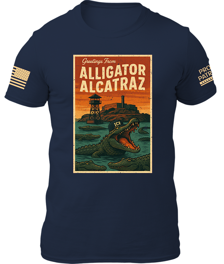 The “Alligator Alcatraz” tee is here to make a statement. This bold, satirical design brings a vintage postcard-style graphic of Alcatraz... overrun by alligators! One of these gators even sports an ICE hat—making it a not-so-subtle reminder that we need strong borders and tough justice.