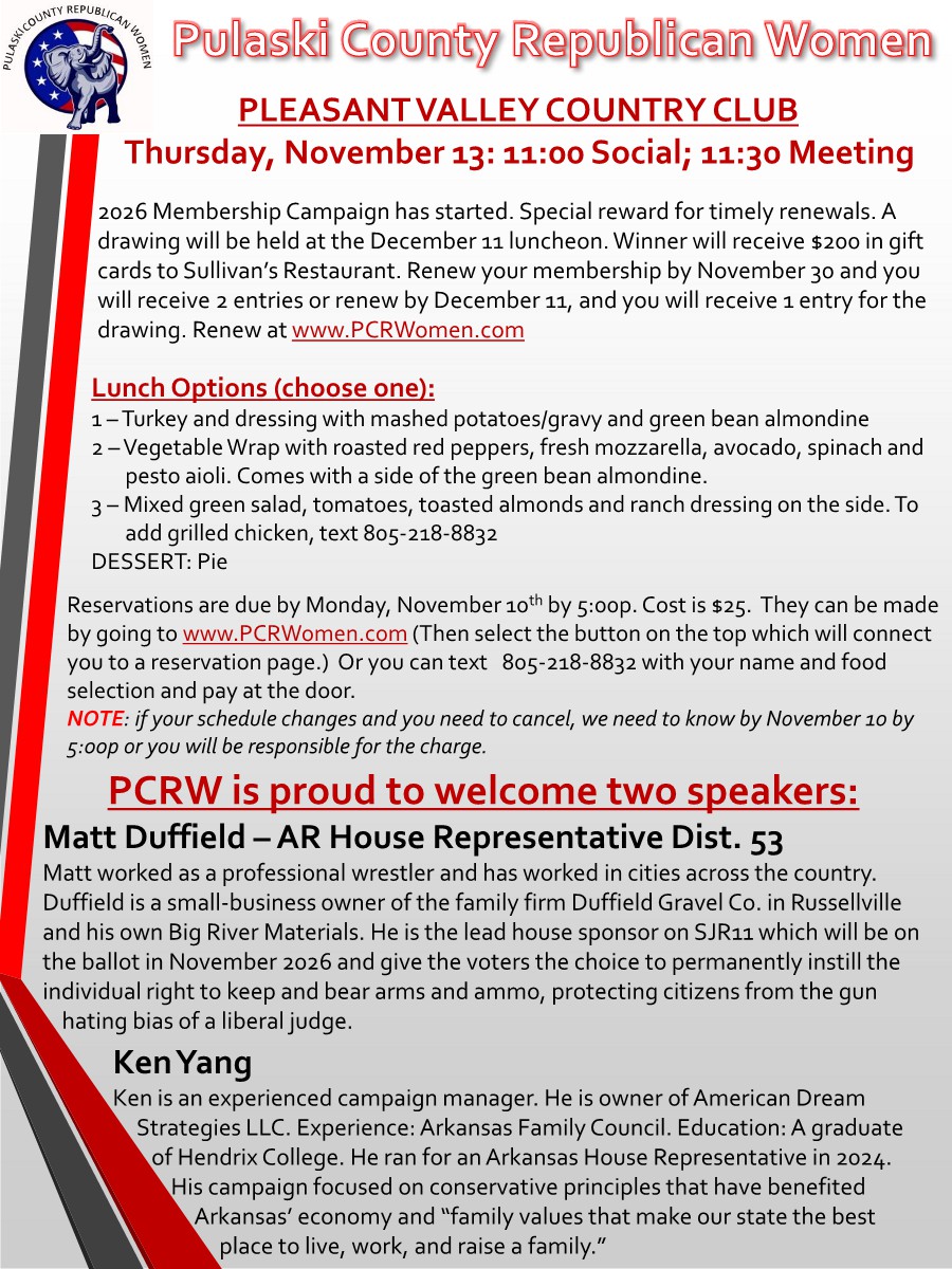 | | This email may be clipped. Click "view entire message" at the bottom of this email to view entire list | | Other Upcoming Happenings | | Pulaski County Republican Women Luncheon with Rep. Matt Duffield and Ken Yang | | Benton County Republicans Star Stripes and Southern Nights Dinner with Attorney General Tim Griffin | | Baxter County Republican Committee Meet Your Candidates Dinner | | Yell County Lincoln Day Dinner with Secretary of State Cole Jester and Arkansas National Hispanic Assembly President Michelle Graetz | | Miller County Republican Committee Candidate Meet and Greet | | | | |