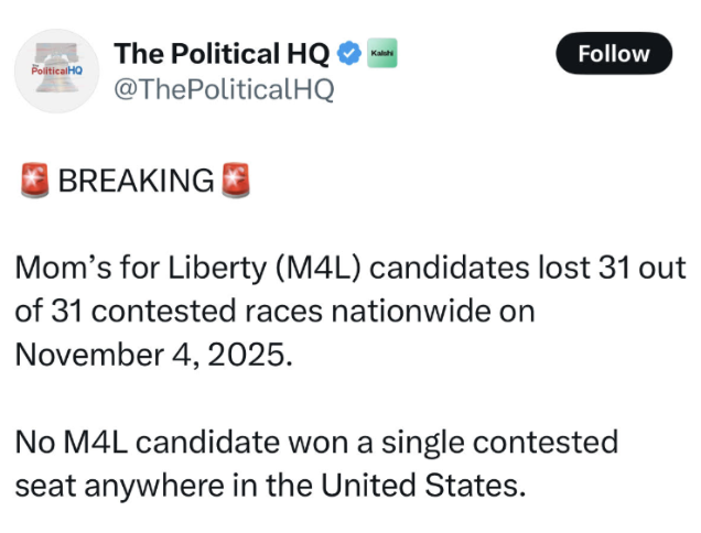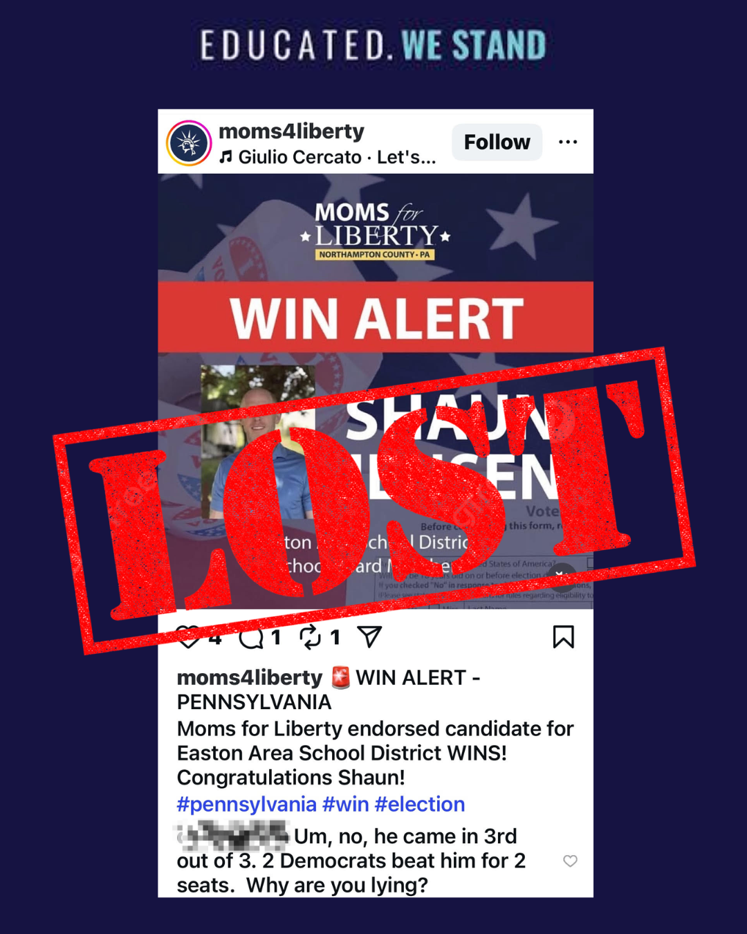 |  JOHN, not a single Moms for Liberty–backed candidate won a contested race on Election Day.  That’s right—31 ran, and 31 lost. And as if that weren’t embarrassing enough, they tried to spin the story the only way they know how: by lying.  Moms for Liberty falsely claimed one of their candidates had won. (Spoiler alert: they didn’t.) It’s official—their influence is shrinking, and their movement is losing steam. But this is not the moment to coast. It’s the moment to press harder. When we organize, when we vote, when we speak up for public education—we win. Donate today to keep our grassroots movement alive and make sure extremist groups like Moms for Liberty can’t claw their way back into power. If you've saved your payment information with ActBlue Express, your donation will go through immediately: — Educated We Stand Paid for by Educated. We Stand. |