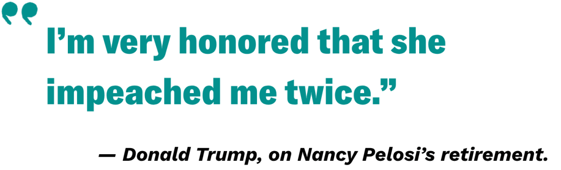What A Day: Madame Speaker's Mic DropNancy Pelosi is retiring. Her would-be successors are ready for the fight.PELOSI-YA-LATERNancy Pelosi’s retirement marks the end of an era. Her would-be successors are pledging to continue her fight against Donald Trump.