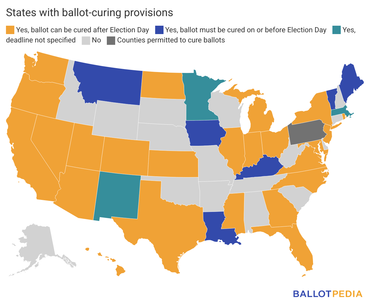 To learn more about legislation related to absentee/mail-in voting and cure provisions, check out Ballotpedia’s Election Administration Legislation Tracker.