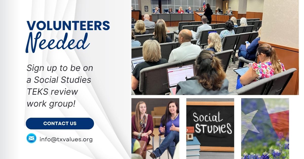 The Texas State Board of Education is in the process of reviewing the Social Studies TEKS for all K-12 public school students. Part of the process includes having work groups draft the TEKS that will later be presented to the SBOE for a vote. Having solid people serve on a work group is crucial in making sure important historical facts are not removed from the Social Studies TEKS drafts!