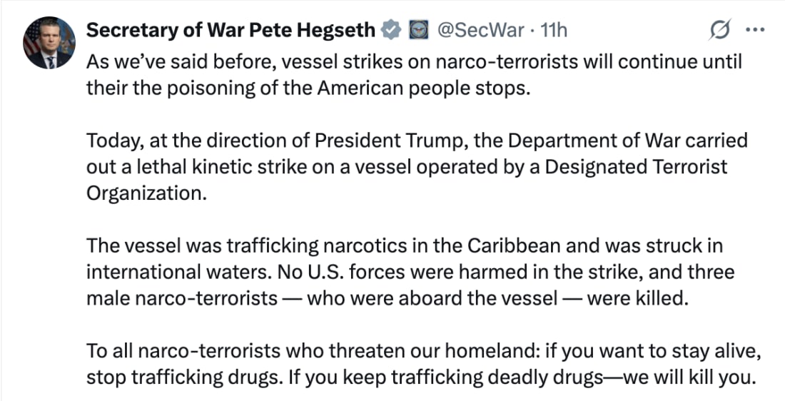 Strike details: Secretary of War Pete Hegseth announced the operation targeted a vessel operated by a designated terrorist organization in international waters. Video footage of the strike showed the moment the vessel was destroyed, and U.S. forces were harmed in the operation. “To all narco-terrorists who threaten our homeland: if you want to stay alive, stop trafficking drugs. If you keep trafficking deadly drugs—we will kill you,” Hegseth said in a post on X.