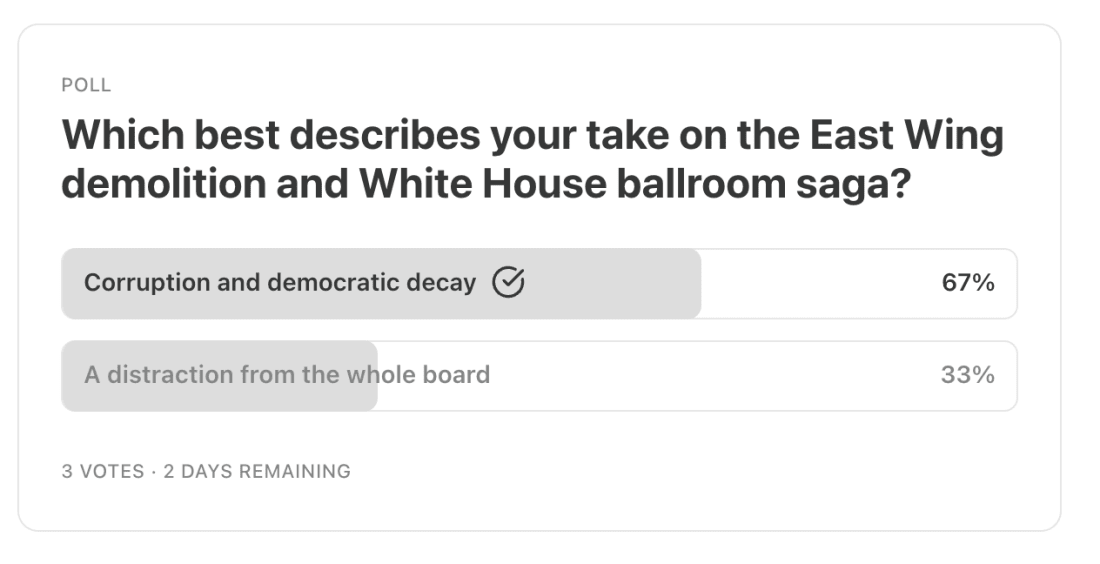 Last week we asked readers to sum up their views on the White House East Wing destruction. Two thirds of you seemed to think this was not, in fact, a move that mattered less. We’d love to hear why! Let us know in the comments. The results are in…🥁 On the fence about becoming a paid subscriber? We have a special offer to make the decision easier for you: $49 for an annual subscription—a 30% discount—ending tomorrow, November 8. Paid subscribers get exclusive benefits like interactive Zoom calls with Garry Kasparov. |
