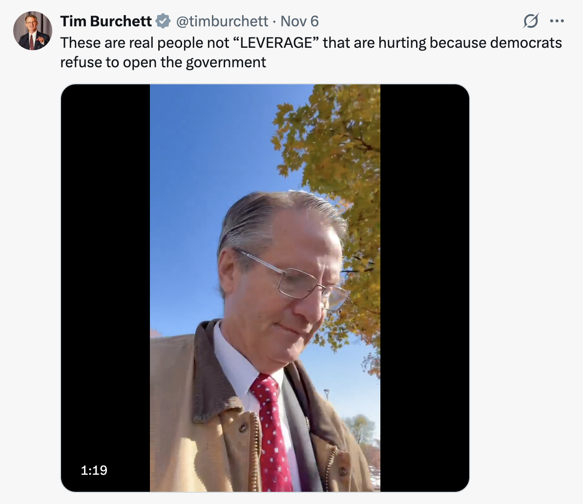 Democrats have voted 15 times to cut off SNAP, and I’d like to remind them they are hurting people by refusing to open the government. The American people are NOT LEVERAGE.