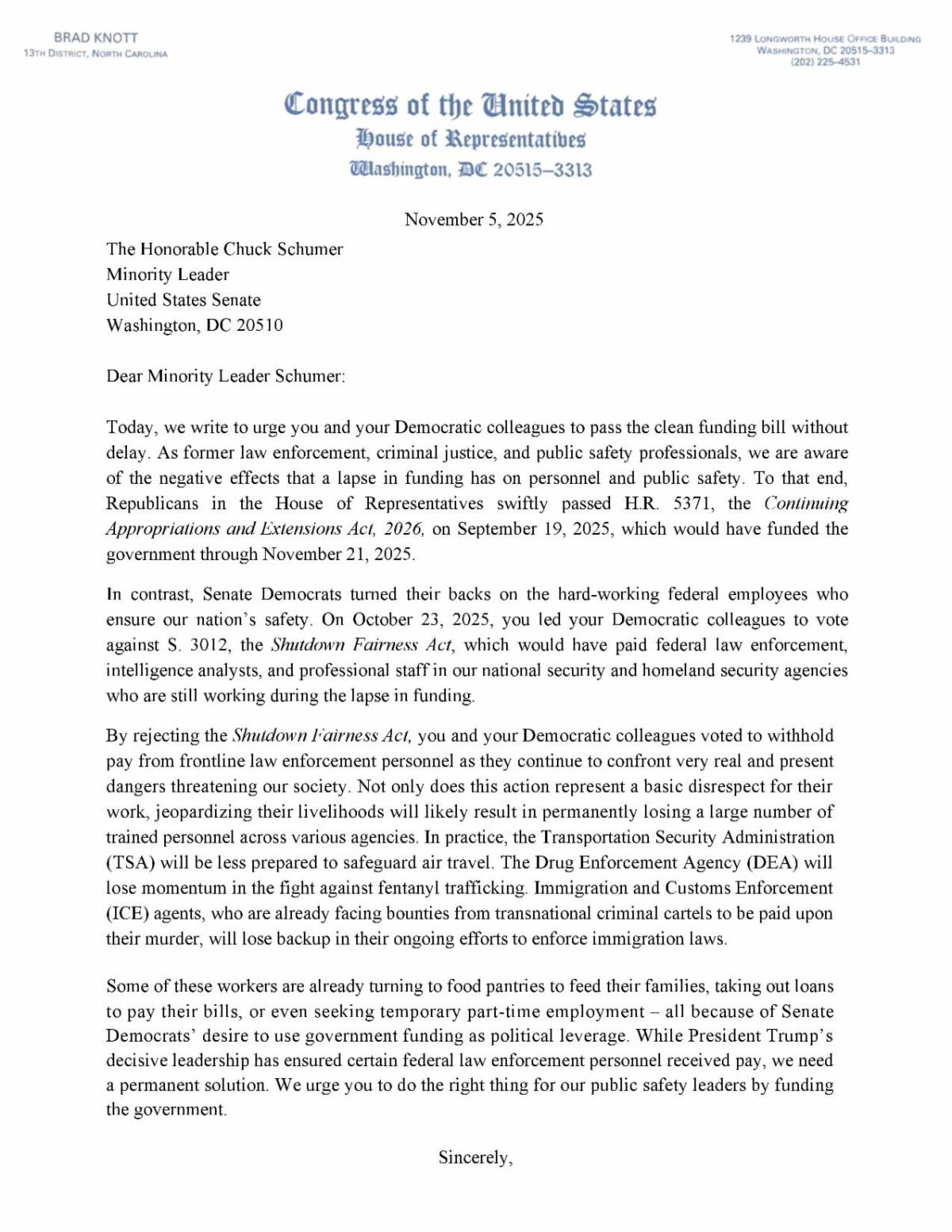 As a former Sheriff, I’ve seen firsthand the sacrifice these public safety professionals make to keep our communities safe. I know what it means to serve and the sacrifices law enforcement personnel make to serve our communities and country. That’s why I joined my colleagues in signing a letter to Senate Majority Leader Chuck Schumer, demanding that he end this shutdown and pay our public safety professionals what they’ve earned.