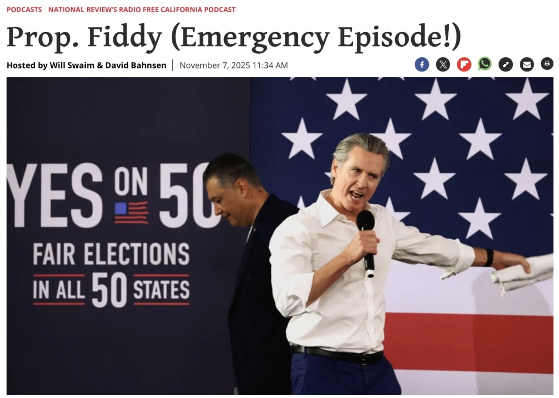 Thank you for being a free subscriber to So, Does It Matter? Please support what we do. And also get 100% of our content (right now you get about 60% of it!). Weekend Political Reading Recommendations!I am perusing the web all week, and I write about some of the things I find. But I there is so much great stuff that I do not write about, but I collect for this Saturday column. Enjoy.This Saturday feature, which is a labor of love for me, is packed with amazing content. It’s very popular. It is a thank you to our hundreds of paid subscribers. There are a few items above the paywall and a bunch below. I did want to express my thanks and appreciation to everyone. This Substack continues to grow at rates that have exceeded all of my expectations. I’m working on setting up a home podcasting studio, with great new equipment. And am working on some great podcast guests for the next few weeks. Stay tuned. As always, if you got this as an email just hit reply if you have any comments or ideas to share. If you are reading it online, well you can hit me up via the BRB (big red button) below. Finally, support my efforts, and also get access to all of this site’s content. Consider upgrading today, and helping me out! Reading/Watching Recommendations!Two For Free! JON FLEISCHMAN IS A GUEST ON NATIONAL REVIEW’S CA PODCAST On Thursday I recorded an “Emergency Episode” on National Review’s Radio Free California Podcast. This great weekly podcast that you should have on your favorites is co-hosted by my friends David Bahnsen and Will Swaim. David was traveling so I stepped in and Will and I do a deep dive on the Prop. 50 debacle. Here’s a link (on this page is a player or, if you look carefully, there are links to Apple Podcast and Spotify). STATE OF GOLD: THE OTHER JON INTERVIEWS STATE SENATOR MARIE ALVARADO-GIL So, you can be the judge. I’m in “evaluation mode” on this particular politician. I do not know, nor have I met her. I have had people I respect tell me good things about Senator Marie Alvarado-Gil. But check out this narrative, and you’ll know why I’m — skeptical. In 2022, thanks to the lame top-two election system, two Democrats beat out like six Republicans to head into a Dem-On-Dem runoff in a very red, Trumpy district. Alvarado-Gil was the winner. Of course lighting isn’t going to strike twice, so everyone (including the Senator of course) knew that the Democrat was not getting re-elected there. Lo and behold — the Senator up and decided she had enough with her liberal party and — reregistered as a Republican. Beleaguered Capitol Republican embraced this switch without hesitation - a win! But is the Senator a conservative, who lost faith in her party? Or a self-serving politician, realigning to save her position? There are a couple of life-long Republicans lined up to challenge her in June… Anyways, let’s watch this as we start to form our own opinions… At some point I will connect with her, and share my opinion. So this Saturday column on the things I have found interesting to read is a thank you to our paid subscribers. There is a lot below - more columns and articles, two great charts, a long form article recommendation, a great video — and a bunch of quick hits. And a birthday celebration! Please support my independent writing where I call balls and strikes by becoming a paid subscriber. There’s a button below to get a free trial!... Keep reading with a 7-day free trialSubscribe to So, Does It Matter? California Politics! to keep reading this post and get 7 days of free access to the full post archives. A subscription gets you: