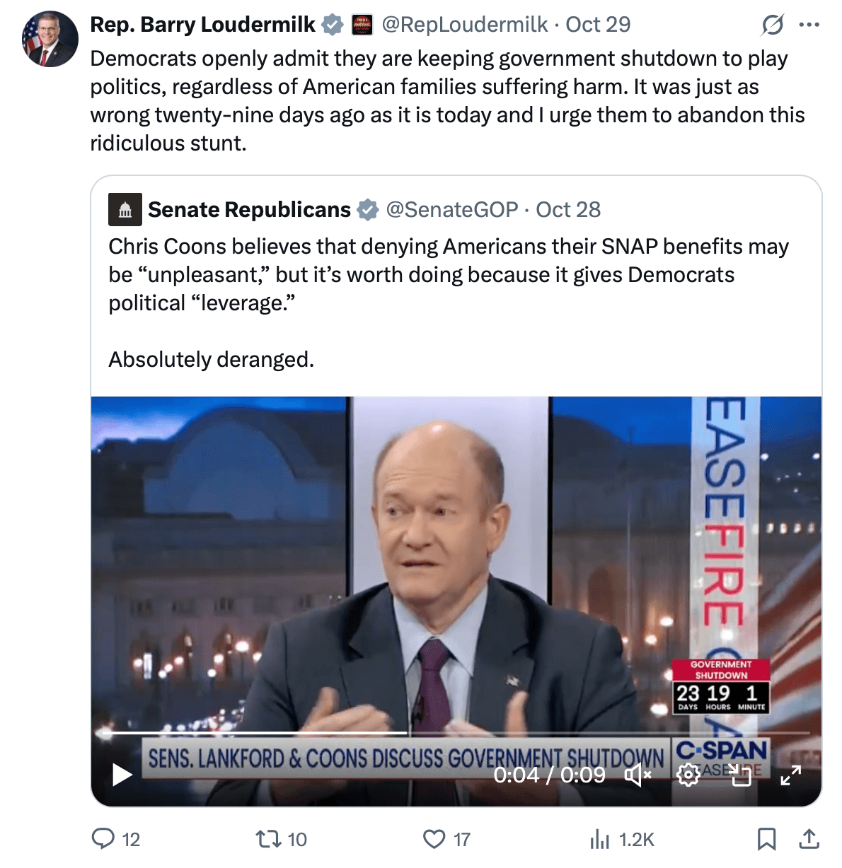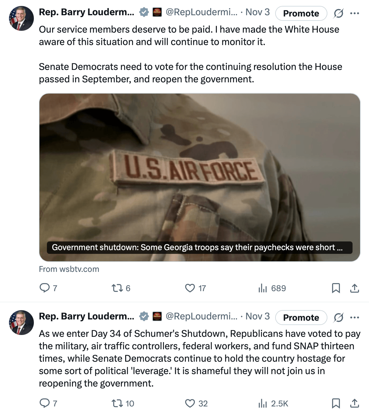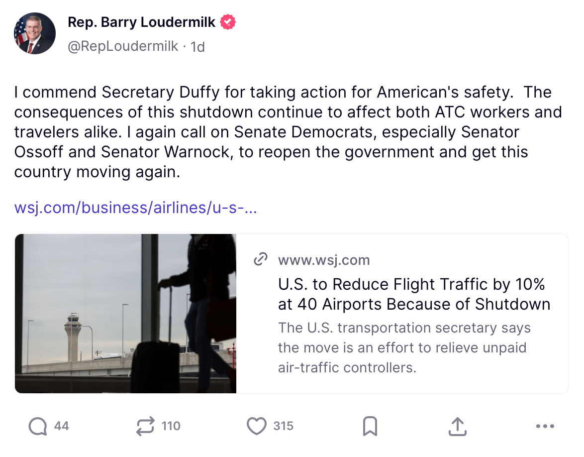 Friends, I hope you are doing well. As your Representative in Congress, it’s a priority to keep you informed of how we're serving you. If you would like to stay up to date, check out our website, and follow our Facebook, Twitter, and Instagram pages. Looking forward to seeing you in Georgia's 11th Congressional District or in Washington, D.C. soon. | Rep. Barry Loudermilk U.S. Congressman, Georgia's Eleventh District | Rep. Loudermilk Has Co-Sponsored the Following Legislation | H.R. 5688 – the Non-Domiciled CDL Integrity Act - Codifies a new US Department of Transportation (USDOT) Interim Final Rule that drastically restricts who is eligible for non-domiciled commercial learner’s permits (CLPs) and commercial driver’s licenses (CDLs). - The rule will make non-citizens ineligible for a non-domiciled CDL unless they meet a much stricter set of rules, including an employment-based visa and undergoing a mandatory federal immigration status check using the SAVE system. H.R. 4583 – the Living Donor Protection Act - Prohibits insurance companies from denying or canceling life, health, disability, or long-term health insurance to someone who is classified as a “living organ donor”. - The bill also codifies the 2018 Department of Labor opinion letter, ensuring that organ donation surgery is recognized as a qualifying medical condition under the Family and Medical Leave Act (FMLA). | Georgia Credit Unions Offer Government Shutdown Assistance | Click HERE for full list list | Food Assistance/Resources in the 11th Congressional District Providing Aid During Government Shutdown | Jobs & Career Resources Available in Georgia | Washington DC Office 2133 Rayburn House Office Building Washington, DC 20515 Phone: (202) 225-2931 | Woodstock Office 9898 Highway 92 Suite 100 Woodstock, GA 30188 Phone: (770) 429-1776 | Cartersville Office 135 West Cherokee Avenue Suite 122 Cartersville, GA 30120 Phone: (770) 429-1776 | |