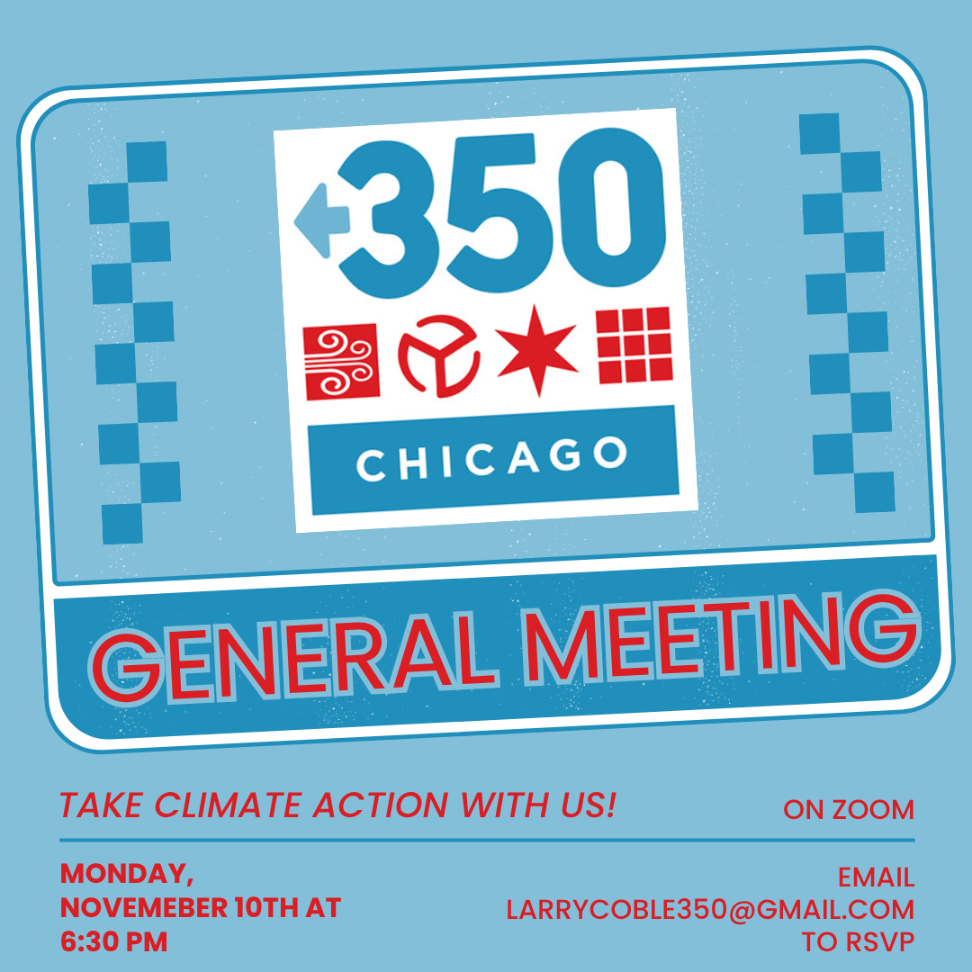 Our next 350 Chicago General Meeting is Monday, November, 10th from 6:30-7:30 PM. To join the meeting, please RSVP to [email protected] and he will send you the meeting link.