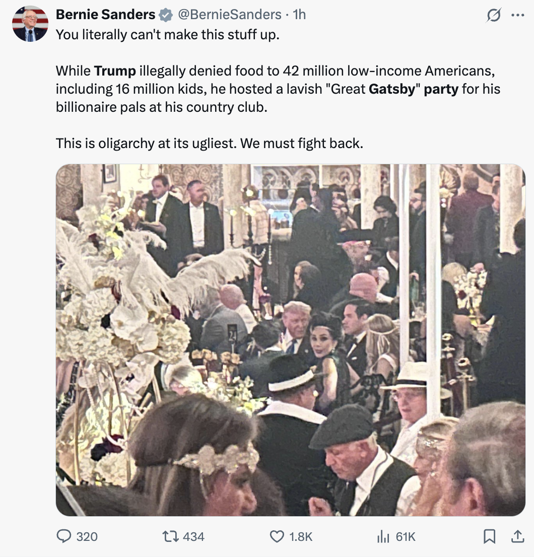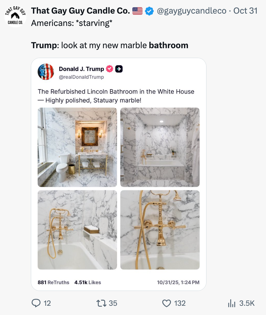 While federal workers go without paychecks, and millions of families brace for delayed or slashed SNAP benefits, Trump is obsessed with ballroom renovations, gold-plated décor, and Great Gatsby–themed Halloween parties at Mar-a-Lago.
