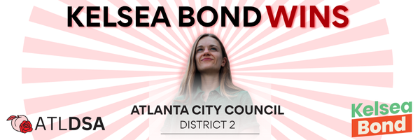On Tuesday, Democratic Socialist Kelsea Bond was elected to the Atlanta City Council. We plan to continue fighting alongside them as they bring the movement for working people into City Hall this spring. Can you help support our work?