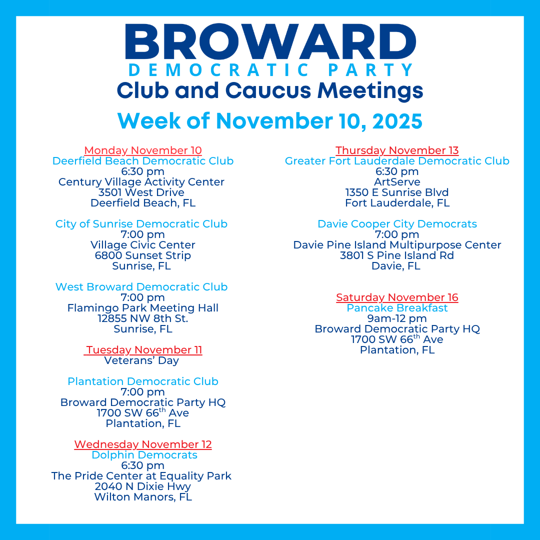 Join the Broward Democrats for their first ever Pancake Breakfast and Canvass on Saturday November 15th. Enjoy fresh pancakes cooked and served by your elected officials. After breakfast we will canvass the neighborhood and register democrats to vote and for vote-by-mail. (optional of course)