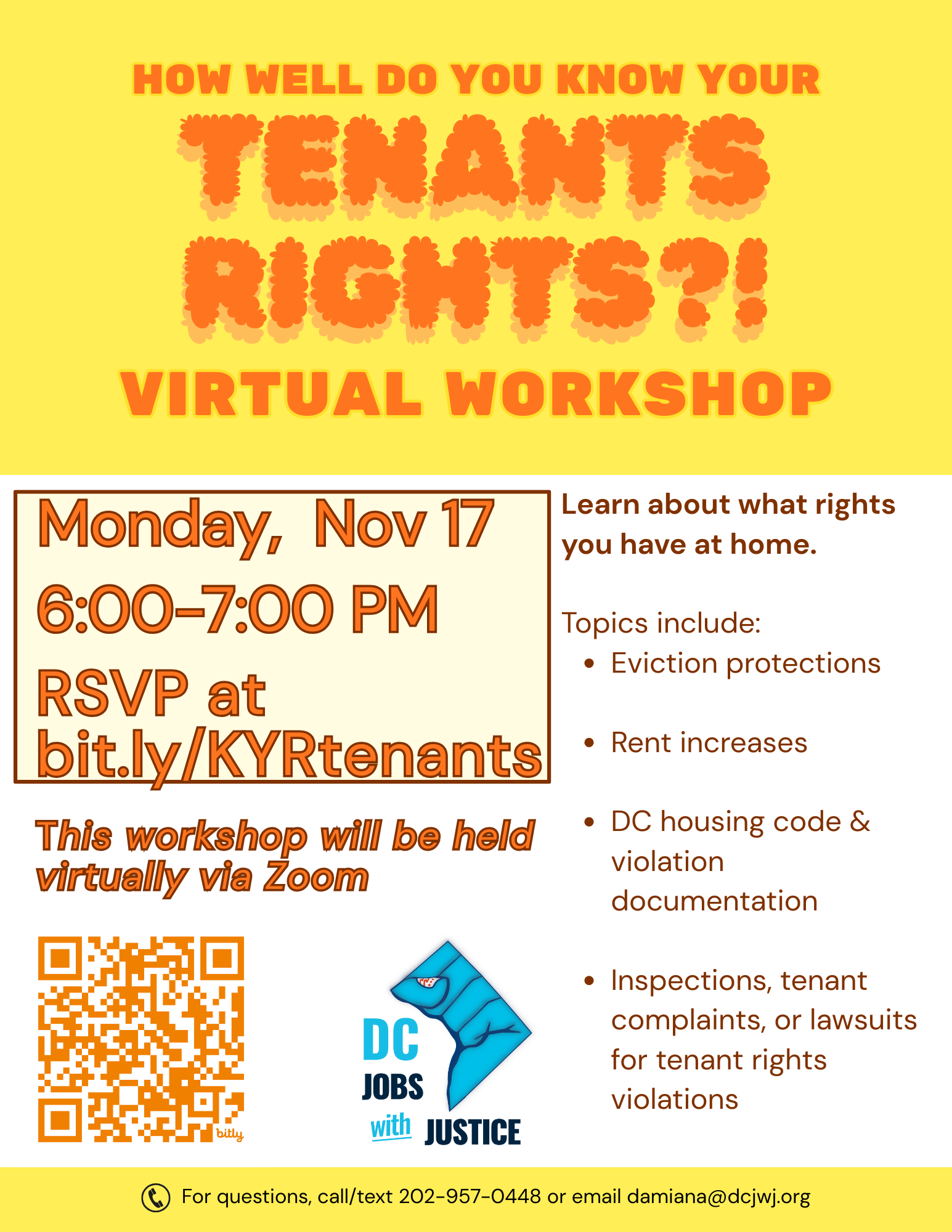 Do you know what rights you have as a tenant in DC? Join us on Monday, November 17 at 6:00PM for a virtual workshop to learn about your rights! Following the passage of the RENTAL Act, tenant rights have changed in the District. RSVP for our workshop here or click the button below to make sure your knowledge is up to date.