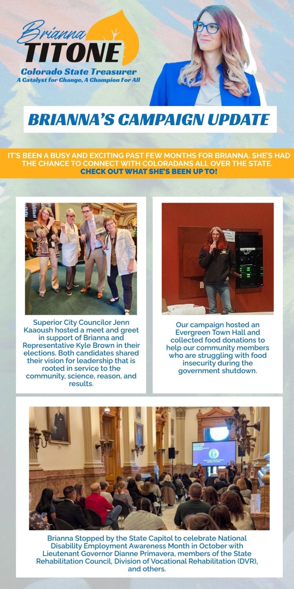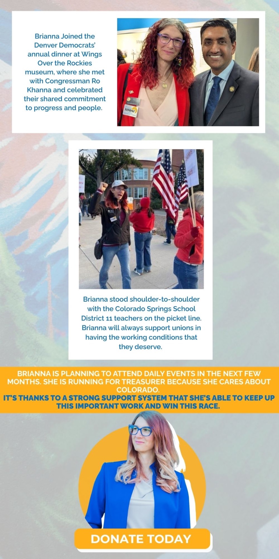 Fighting for working families, consumer protections, and small businesses in the House of Representatives has been the honor of Brianna's lifetime. Brianna is running to be your next Colorado State Treasurer to support small businesses, and fight hard to save hard-working Coloradans money.