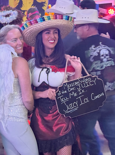 She donned a sombrero and wore a vile sign, meant to be read in a crude Mexican accent that stated, “Mexican word of the day: Juicy. Tell me if juicy ICE coming.”