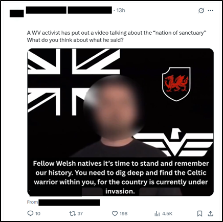 On November 3, the British neo-Nazi group White Vanguard created a new account on the X platform approximately 48 hours after their prior account was suspended. On the new account, the group posted a video of a Welsh member of the group condemning the presence of non-white people in Wales and calling immigration an “invasion.” A recent article noted White Vanguard’s presence on social media and its history of promoting neo-Nazism, antisemitism, and racism.