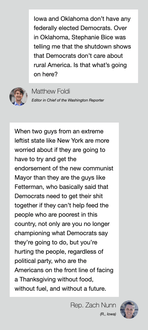 EXCLUSIVE: Zohran Mamdani’s win silences House Democrats and Democratic candidatesby Matthew Foldi Zohran Mamdani’s convincing win in the New York City mayoral election is great news for the city’s Democratic Socialists of America chapter, but House Democrats and Democratic candidates are already struggling to respond to charges that the socialist Mamdani is the leader of their party. The National Republican Congressional Committee (NRCC) compiled a series of videos, obtained exclusively by the Washington Reporter, of Democratic candidates and lawmakers outside the Democratic Congressional Campaign Committee’s (DCCC) new candidate week in Washington, D.C. Democrats of all stripes running across the country had nothing to say when asked if they would support Mamdani, if they want his support, or if they think he is the future of their party. In one case, James Osyf, who is running against Rep. Jen Kiggans (R., Va.), was physically pushed into the building when he was asked if he will “condemn Zohran Mamdani.” For some Democrats, like Beth Davidson, Mamdani’s win happened in their backyard. Davidson is running in a crowded primary to take on Rep. Mike Lawler (R., N.Y.), but she had no answer when asked if she is “happy that Mamdani is now leading New York.” EXCLUSIVE: Rep. Troy Downing rolls out legislation to require national cemeteries to remain open on federal holidaysby Matthew Foldi In advance of Veterans’ Day, Rep. Troy Downing is unveiling legislation, obtained exclusively by the Washington Reporter that will allow veterans to access national cemeteries on federal holidays like Veterans’ Day and Memorial Day. Downing’s legislation, called the National Cemetery Access Act, would require national cemeteries to remain open during federal holidays. In Downing’s own district, for example, Custer National Cemetery at the site of the Battle of Little Bighorn was closed on Memorial Day. Downing himself has spoken with the Reporter about his unorthodox path to military services. Hours after the September 11th, 2001 terrorist attacks, he walked into a recruitment office and joined the military, ultimately serving multiple tours in Afghanistan. SCOOP: Rep. Zach Nunn highlights the Iowa impact of the Democrats’ shutdownby Matthew Foldi For much of his time in Congress, Rep. Zach Nunn (R., Iowa) has been on a “quest to turn DC into Des Moines.” But, as the Schumer Shutdown entered its second month, Nunn had no choice but to bring the government to his constituents. In his latest district-wide trip, the details of which were obtained exclusively by the Washington Reporter, Nunn met with industry leaders in public safety, education, agriculture, and more — and finished the tour with a clear message that Republicans and Democrats need to work together to open the government back up. “Senate Democrats just broke Washington’s record for dysfunction,” Nunn explained. “As we hit the longest shutdown in American history, I spent the day with Iowa farmers, veterans, small business owners, families, and volunteers stepping up to fill the gap. Across the board, the message was clear: stop the political games and open the government.” Nunn kicked his tour off by meeting with Iowa’s Agriculture Secretary Mike Naig at Heartland Co-Op’s Avon facility in Carlisle. The duo was joined by Co-Op CEO Tim Hauschel and producers from across central Iowa, and they covered how the Schumer Shutdown is compounding the stresses they already have from harvesting season. A message from our sponsor.