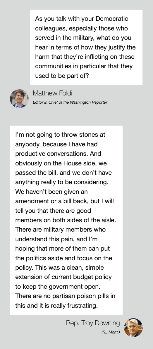 If you have a tip you would like to anonymously submit, please use our tip form — your anonymity is guaranteed! INTERVIEW: Rep. Troy Downing’s Veterans Day message: “Service is a noble act”by Matthew Foldi Rep. Troy Downing’s (R., Mont.) path to military service was unconventional, to say the least. Downing, born as the “product of an unplanned pregnancy of an unwed teenage mom” went on to have an extraordinarily successful career in business — but the terrorist attacks of September 11th, 2001, changed his life forever. “When September 11th hit and this nation was under attack, it made me think: what have I ever done to deserve this country?” Downing asked during an interview with the Washington Reporter shortly before Veterans Day. “This country is one of the few places you can be the product of an unplanned pregnancy of an unwed teenage mom, without family money, without family connections, and be as successful as I was, and I needed to feel like I deserved it.” Following the Islamic terrorist attacks, his “initial reaction was, I wasn’t sure how to serve, and after a couple of days of thinking about it, I came to conclusion that I needed to serve. I needed to be part of the solution of these terrorists attacking this country that had been so good to me. And so I walked into a recruiter’s office, and I was not prior military, and I had very little knowledge of how it worked or what I was getting into, and I told the recruiter, ‘I used to teach at New York University. I’ve got a pilot’s license. What can you do with me?’ And the recruiter looked me in the eye and said, ‘how old are you?’ And I said, ‘34,’ and he went, ‘good, 35 is the cutoff.’” Downing, who had no prior military training, reported to boot camp as the “oldest man” there, but emerged as an honor grad, and then he “deployed every time they asked me: I deployed twice to Afghanistan, during Operation Enduring Freedom.” INTERVIEW: Rep. Zach Nunn on the harms of the “catastrophic” Schumer Shutdown and how Trump’s Asia trip is helping the Midwestby Matthew Foldi While the Schumer Shutdown has devastated Americans across the country, Rep. Zach Nunn (R., Iowa) has spent the past few weeks meeting with constituents who have been devastated by what he categorized as the Democrats’ “partisan, extreme primary politics” that have ground America to a halt. The Washington Reporter previously covered Nunn’s latest tour of Iowa’s 3rd District; now Nunn, in his latest interview with the Reporter, shared his thoughts on how Democrats are abandoning their roots in states like Iowa and how President Donald Trump scored a major win for farmers, manufacturers, and rural Americans during his most recent trip to Asia. Nunn, a self-described “common sense conservative” who represents one of the most competitive districts in America, painted a bleak picture of how the Schumer Shutdown has devastated districts like his. The “harvest is ongoing. The Department of Agriculture’s offices are closed. We’ve got guys who are having their hardest farm year ever, and it’s coming on the back of the fact that the president has gone above and beyond to try and open up new markets, particularly in Asia, for things like soybeans, corn, and beef. All good news.” Heard on the Hill