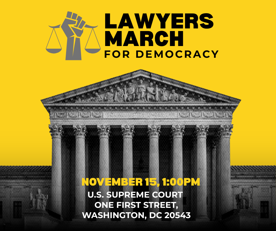 That’s why, on November 15, 2025, at 1:00 PM ET, outside the U.S. Supreme Court, lawyers, law students, jurists, and allies will stand up and speak out at the Lawyers March for Democracy. We will use our voices and our expertise to uphold our commitment to the Constitution and our rule of law.
