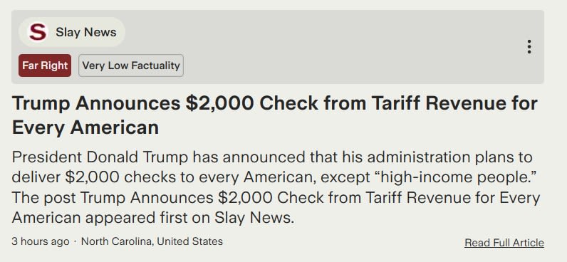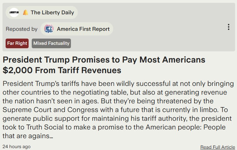 Politics and Culture in Plain Talk. Checks MixWelcome to the Donnie Win-Free (Money) Show: You Get $2000!, You Get $2000! You Get $2000!In a move not at all related to the latest election results or the impending Supreme Court decision on tariffs, Donald Trump announced over the weekend on social media that we are all getting at least $2000 from the government. Our windfall is due to the immense success of the Republican tariff scheme, Trump said. “People that are against tariffs are FOOLS!,” he added. Yay! I hope the checks are signed by Donnie just like he signed that naughty birthday card for his good buddy and dating wingman, Jeffrey. (Hey, what ever happened to those files?) Oops, I said “all of us.” That’s not quite right. What Trump said was, “A dividend of at least $2000 a person (not including high income people!) will be paid to everyone.” I am certainly not a high-income person, and neither is my wife. I imagine I will use my big, fat check to buy something nice for her. She will probably spend hers on cat toys and parts for her moonshine still. Oops, again. Our free money might not come in the form of checks. According to the Trump administration’s resident soybean farmer, Treasury Secretary Scott Bessent, the form of payment is unsettled and could include tax changes instead of immediate checks. That is not cool. You can always count on a super-wealthy soybean farmer to throw cold water on your cat-toy-funding plan. Tax changes won’t arrive in time to put toys in kitties’ Christmas stockings or corn squeezin’s in our eggnog. I was a bit unplugged over the weekend, as I was the guest of honor at the Marine Corps Birthday Ball in Fargo on Saturday. In my humble opinion, a guest of honor should not have to scoop kitty litter, but my wife doesn’t have quite so fine a sense of etiquette. She also believes my guest-of-honor title expired somewhere between Fargo and Minot—probably Valley City, or even sooner, in her mind. So, I didn’t know about the tariff “dividend” announcement until I opened Ground News on Monday morning and found that the story was reported by over 400 news sources, with almost half of them rated as center-biased and around three quarters of the remaining sources rated as biased to the right, from lean right to far right. This story is what Ground News calls a “Blindspot” for the left. Twice as many sources from the right are reporting the story than from the left, and less than one-sixth of the sources overall have a left bias rating. A person in a left-of-center information silo could miss it. This is why I often start my day in the Blindspot Feed: It let’s me see what I might otherwise miss, and there are some important stories there along with the crazy talking points and rationalizations I like to poke fun at. My wife and I missed this story at first because we were intentionally unplugged for the weekend and listened to music and an episode of the This is Actually Happening podcast as we drove home.¹ Speaking of podcasts, this story was mentioned on a few of them. My wife, Kelli, listens to podcasts way more than I do, and she sends me links with timestamps for the parts she thinks I should listen to. On Monday, I discovered that Ground News provides podcast mentions of stories with timestamps, and they don’t try to sneak in any relationship advice. So, I now love Ground News just a little bit more without loving my wife any less. The “Podcasts and Opinions” section precedes the print stories and is a new feature. It is definitely useful for me because podcasts can be long, and I tend to hear the first couple of minutes and then the part where the hosts say they hope I will join them again next time. If you want timestamped podcast links without any annoying lists of things good husbands do, you can still get 40% off the Ground News unlimited-access Vantage plan (what I have) using my link, groundnews.com/punch or by clicking the button below. On the xxxxxx Takes podcast, Sam Stein and Jack Cocchiarella talked about how Farmer Bessent is “going to have to literally cash some checks that Donald Trump is writing.” Instead of breezing through a Sunday morning interview on ABC, Bessent had what we in Naval Aviation call a “helmet fire in flight.” To his credit, Bessent knew that what Trump was proposing would cost many times more than what Americans have paid the U.S. government in tariffs. He couldn’t say that Trump’s post was ridiculous, so he suggested that our $2000 might come in many forms or might already be accounted for in the Republicans’ Big Beautiful Bill. In case you’ve forgotten, that’s the bill that will make many Americans’ health insurance premiums go up by more than $2000. Even far-right-rated Slay News pointed out that the best expectations for tariff revenues would cover less than a third of the current fiscal-year deficit, so Trump’s talk of paying down the debt with tariffs is a fantasy. I want to believe it, though, so I sought out a post from a source on the right that would be more optimistic about my $2000 check. Even Breitbart wouldn’t go that far. Fortunately, J.D. Rucker at The Liberty Daily (“The Conservative Alternative to the Drudge Report”), gave me hope. He concluded his Sunday, November 9th piece with this: