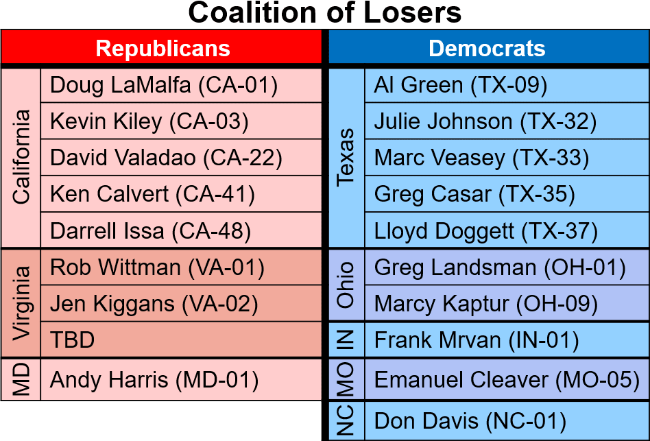 America's Coalition of LosersRecent gerrymanders will cost more than 19 members of Congress their jobs. On their way out, they're the perfect people to end this gerrymandering nonsense.This post is all about gerrymandering.¹ If you live in Missouri, sign the petition to undo the state’s recent gerrymander! You’ll have to do it in person; here’s more info on where you can sign.² The deadline to gather enough signatures to qualify for a ballot measure is in early December, so get on it. In the months since Texas kicked off its gerrymander, it’s become clear that the Republicans probably overplayed their hand. When I first wrote about this back in August, I predicted that when the dust settled, Republicans would probably net two House seats. But as the tit-for-tat gerrymanders have played out more, it’s become possible that the Democrats will actually gain seats, in large part because of how aggressive Democrats have been in pushing for state constitutional amendments.³ I supported California’s efforts to redraw its Congressional districts to counter what was happening in Texas, but I also called out that the whole fight around gerrymandering is really bad for Americans: