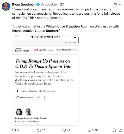 It’s part of a desperate attempt by Trump to stop Congress from gathering enough signatures for a petition that would compel the Justice Department to release the Epstein files to the public.
