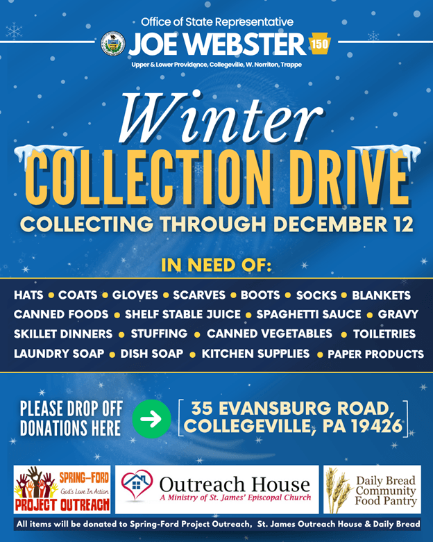 There is no cost to participate but all vendors must apply and be approved. For more information, reach out to Nicole at [email protected] | Heads up, neighbors! The current construction on Ridge Pike is scheduled to last through Friday, January 29, 2027. During this construction, Ridge Pike will be reduced to a single lane in each direction 24/7 between Germantown Pike and Crosskeys Road. Drivers are advised to plan accordingly and practice safe driving habits while crews are at work. | | Helpful Information/Other Events | Free VA S.A.V.E. Suicide Prevention Course | Tonight from 6 p.m. to 8 p.m., the Coatesville VA will be hosting VA S.A.V.E. Suicide Prevention Course, a free event for service members, veterans and their families. Stop by the VFW Post 9788 at 324 Sawmill Lane in Horsham, PA, and learn about how to assist someone who is experiencing a crisis and options for firearm storage. | Strong Minds, Safe Bodies: A Victim Services Center Event | The Victim Services Center of Montgomery County is hosting a free community wellness event for youth and families called Strong Minds, Safe Bodies. This event will feature wellness workshops, creative activities and community resources! Safe Minds, Strong Bodies is this Saturday, November 15, from 1 p.m. to 3 p.m. at The Ricketts Center (640 Beech Street, Pottstown, PA 19464). You can RSVP here | If you’re a senior 65 or older, you can ride SEPTA for free! Stop by my district office at 35 Evansburg Road with a valid form of ID and my staff can help you sign up for a free SEPTA Senior Fare Card. My office hours are Monday through Friday, 9:30 a.m. to 4:30 p.m. | If you need state-related assistance, my office can help you! Please feel free to contact my staff with any questions by calling 484-200-8263 or emailing [email protected] | Decorate Collegeville’s Christmas Tree Saturday, November 22, from 11 a.m. - 12 p.m. E. Third Ave and Main Street, Collegeville, PA Pet Photos with Santa from lower Providence Township Thursday, December 4, from 6 p.m. - 8 p.m. Eagleville Park (Bocce Courts) – 100 Parklane Drive, Eagleville, PA 17th Annual Community Tree Lighting from Lower Providence Township Friday, December 5, at 6:30 p.m. Eagleville Park – 100 Parklane Drive, Eagleville, PA 6th Annual Tree Lighting Ceremony from West Norriton Township Saturday, December 6, at 6 p.m. 1630 W. Marshall St, Norristown, PA Note: Donations will be accepted for Jefferson Fire Co’s Toys 4 Kids Blizzard Bash Open House from Upper Providence Township Friday, December 12, from 5:30 p.m. - 7 p.m. Upper Providence Community Center – 499 Hopwood Rd, Collegeville, PA Note: Registration required here | Please continue to stay safe, healthy, and well-informed. And, if you have questions about any state-related issue, please contact my office at 484-200-8263 or email [email protected]. If you wish to unsubscribe to this email, please scroll to the bottom where it says, “Update Email Preferences.” Sincerely, Rep. Joe Webster State Representative 150th Legislative District | District Office 35 Evansburg Road Collegeville, PA 19426 (484) 200-8263 | Pennsylvania State Capitol 125-B East Wing P.O. Box 202150 Harrisburg, PA 17120 (717) 787-0419 | |