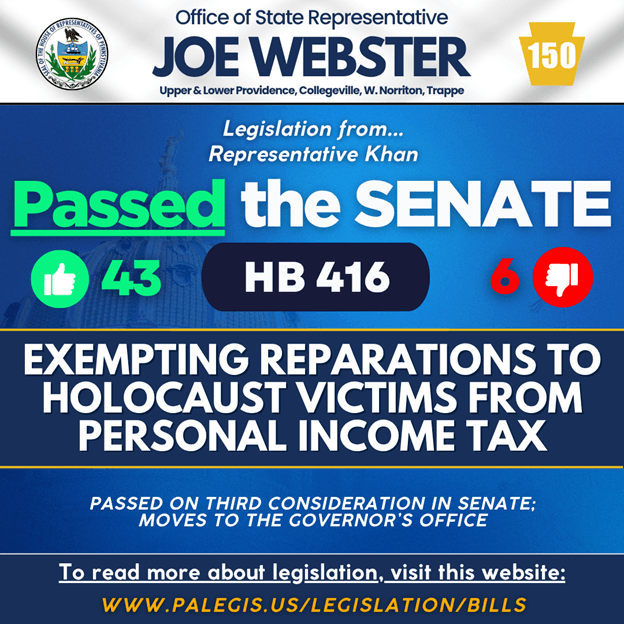 Dear Neighbor, I hope you are well. My colleagues and I made our return to Harrisburg this week, and today we voted and passed our long overdue state budget. After finally bringing this to an end, I will continue to provide updates on important components of this state budget. This week, I wanted to update you on what I’ve been up to, helpful information and some events my office is hosting, including my Winter Collection Drive and Veterans’ Breakfast. As always, I hope you find the information below useful. | Important Updates/Highlights | Pennsylvania State Budget Update | Neighbors, this morning my colleagues and I in the Pennsylvania House voted on and passed our long overdue state budget (SB 160), which the governor also signed. This is a budget with bipartisan support that doesn’t raise taxes, supports disability services and our health care systems, sparks growth for our businesses and honors the education fair funding formula, which the Commonwealth is constitutionally obligated to do in PA after years of underfunding our schools. While this budget doesn’t meet all of the goals I and the majority of my colleagues in the House have been working toward, the real disappointment is how long it took to finalize in the Republican-led Senate. I’m glad we are finally able to get Pennsylvania back on track, paying our local businesses who hold state contracts, removing the worry from school districts and municipalities who were contemplating loans to operate, and ensuring that projects in need of funding are eligible for completion. Over the next few weeks, I’ll provide more detailed summaries on what the PA budget means for its residents via email and social media. Please reach out to my office at [email protected] with any direct questions. | Neighbors, my office is hosting our annual Winter Collection Drive now through December 12. We’re collecting canned foods, winter clothing, toiletries, paper products and more. Please check out the list for some of the most needed items. All donations will be delivered to St. James Outreach House, Daily Bread Community Food Pantry and Spring-Ford Project Outreach. You can drop off donations at my office on 35 Evansburg Rd, Collegeville, PA 19426. | H.B. 886 Passes House Judiciary Committee | I’m pleased to announce that my bill, H.B. 886, unanimously passed the House Judiciary Committee this afternoon. H.B. 886, titled “Supporting Veterans Exiting Incarceration”, requires that veterans who are incarcerated in a State Correctional Institution (SCI) are to be given a "veterans benefits briefing" before they are released. Among the topics to be discussed are state and federal benefits available to the veteran and their family as well as how to access and apply for them. While they are often able to get some or all their earned benefits back upon release, very few veterans who serve time in a correctional facility know what benefits they are entitled to, how to apply for them, and where to get help or ask questions. Read more about it here | H.B. 416 Passes in Senate | I’m also excited to share that Representative Khan’s House Bill 416, which I’m a proud co-sponsor of, passed the Senate on third and final consideration with a 43-6 vote. The bill has passed both the Senate and the House and now heads to Governor Shapiro’s desk for his signature. This legislation will exempt reparation payments and court judgements for stolen property for victims of the Holocaust for the personal income tax. As a result, this will allow victims of the Holocaust to retain 100% of their reparation payments and restitution awards. If you’d like to read more about it or track its progress, click here: palegis.us/legislation/bills/2025/hb0416 | My annual Veterans’ Breakfast is next Thursday, November 20, at Chadwick’s Restaurant & Bar from 8:30 a.m. to 10 a.m. Be my guest as I share updates on legislative matters involving Pennsylvania veterans. Registration is required and space is limited! To reserve your spot, you can call my office at 484-200-8263! | Parkhouse Visit to Honor Veterans | On Monday, I had the pleasure of visiting Parkhouse Nursing & Rehabilitation Center with Senator Katie Muth to honor and recognize each resident who is a veteran. We presented them with a certificate, a pin and thanked them for their bravery, commitment and service to our country. It’s important that we thank our veterans whenever we have a chance, small acts of kindness like this can mean a whole lot, and it shows that we truly appreciate their service. Expressing your gratitude for their service could be as simple as inquiring about their experiences while they served, where they were stationed, and which branch they had the privilege of representing. | Neighbors, please be advised that the opening of the 2025-26 Low-Income Home Energy Assistance Program (LIHEAP) will be delayed until December 3, 2025, because the Pennsylvania Department of Human Services has not received its funding for the program due to the federal government shutdown. LIHEAP provides cash grants to help Pennsylvania families pay their heating bills. More information can be found by clicking here | PUC Suggestions for Heating Bills | Due to rising costs, weather and uncertainty/delays with federal assistance programs like LIHEAP, the Pennsylvania Public Utility Commission (PUC) is urging consumers to act now if they are worried about winter heating bills. Here’s a checklist from the PUC on what you can do to prepare and stay connected to essential utility services: - Review your utility bills. Understand your current rate and usage — and how colder weather can increase demand.