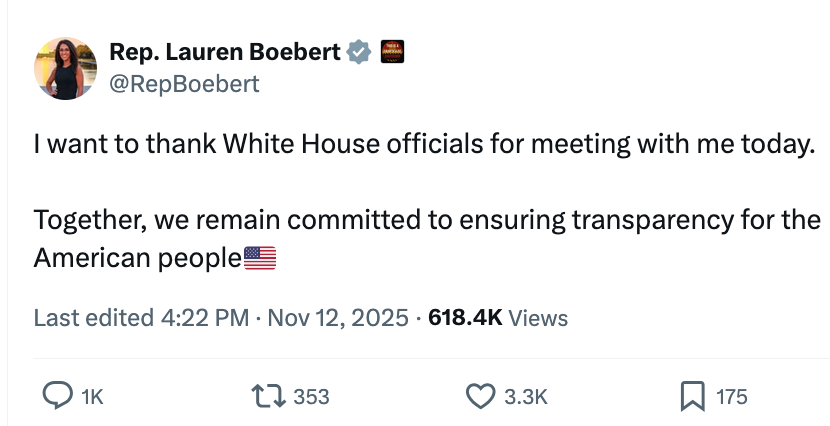 The meeting was a desperate hail mary by Trump to stop Congress from gathering enough signatures on a petition, which Boebert has signed, that would compel the House to vote on getting the Justice Department to release the FBI’s Epstein files to the public.