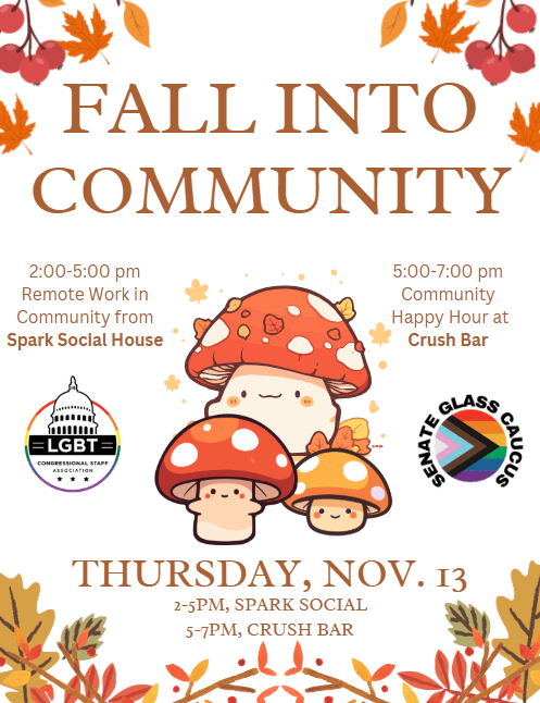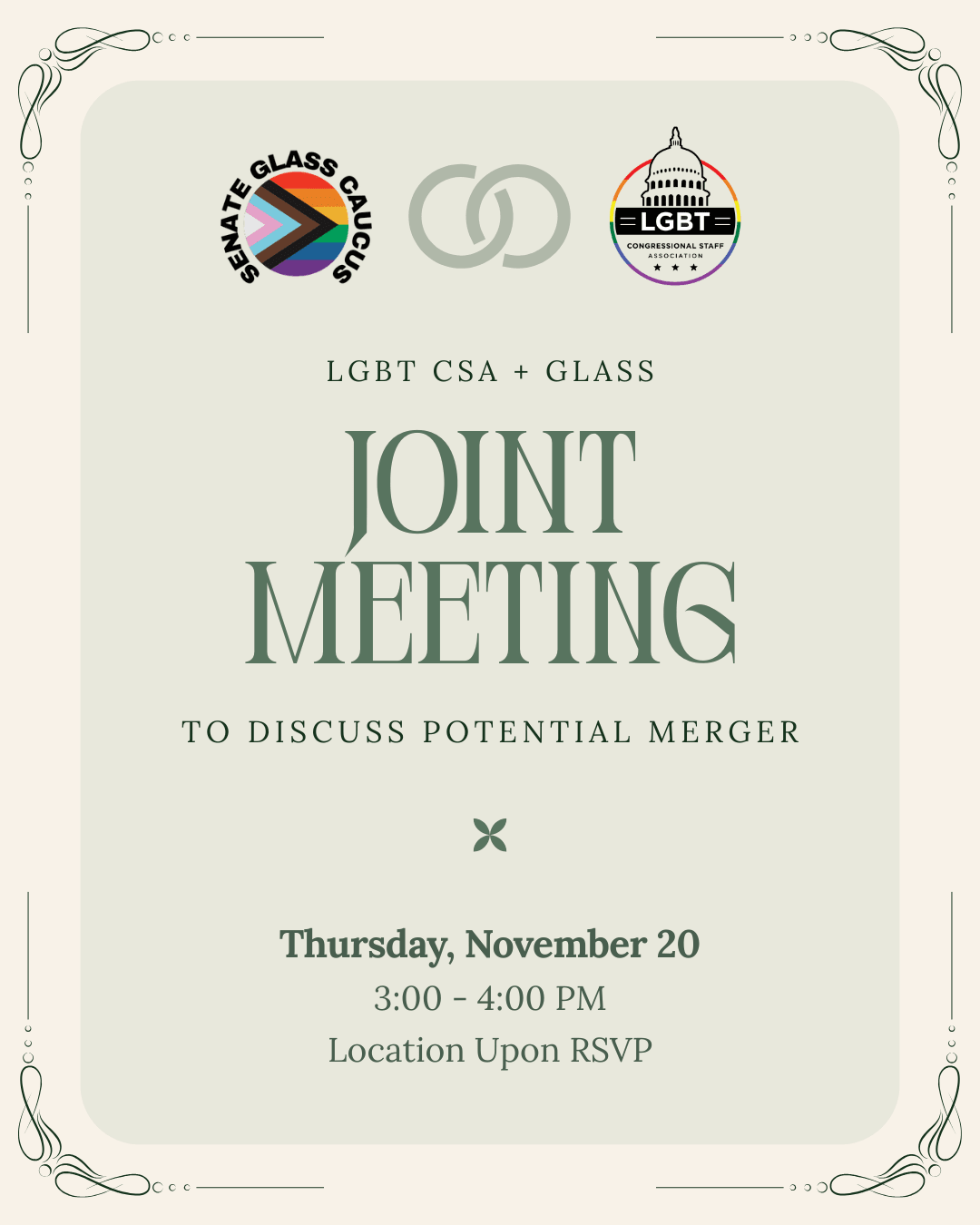 Reminder: Happy Hour TODAY!Join GLASS and the LGBT Congressional Staff Association (LGBT CSA) for a happy hour tonight from 5:00-7:00pm at Crush Bar. We hope to see you there! Joint Member MeetingGLASS will have a joint member meeting with LGBT CSA on Thursday, November 20. Please note this meeting is only open to dues paying members of GLASS and LGBT CSA.