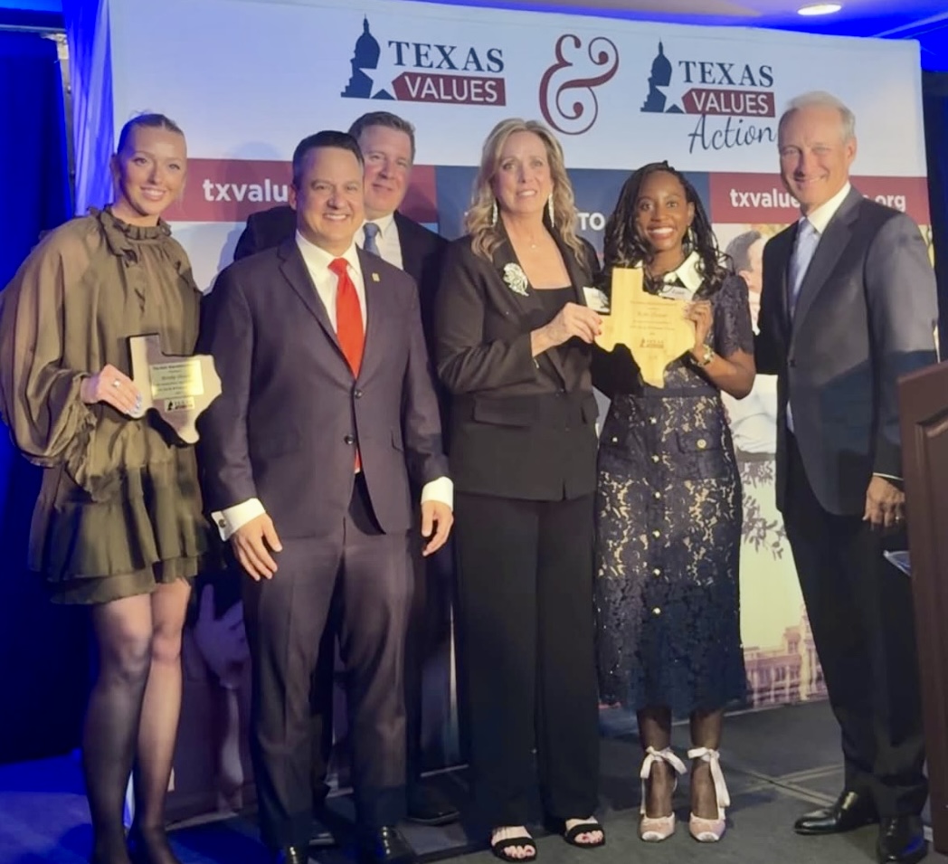 Texas Values gave out the Kelly Shackelford (pictured at right) award to winners Brooke Slusser and her mother Kim Slusser pictured with Jonathan Saenz, Jonathan Covey, and Mary Elizabeth Castle at the Gala held last Saturday in Dallas.