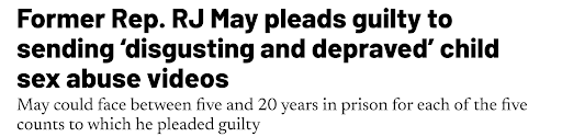 ICYMI: South Carolina Republican State Representative RJ May has pleaded GUILTY to FIVE counts of possessing and distributing child sex abuse material.