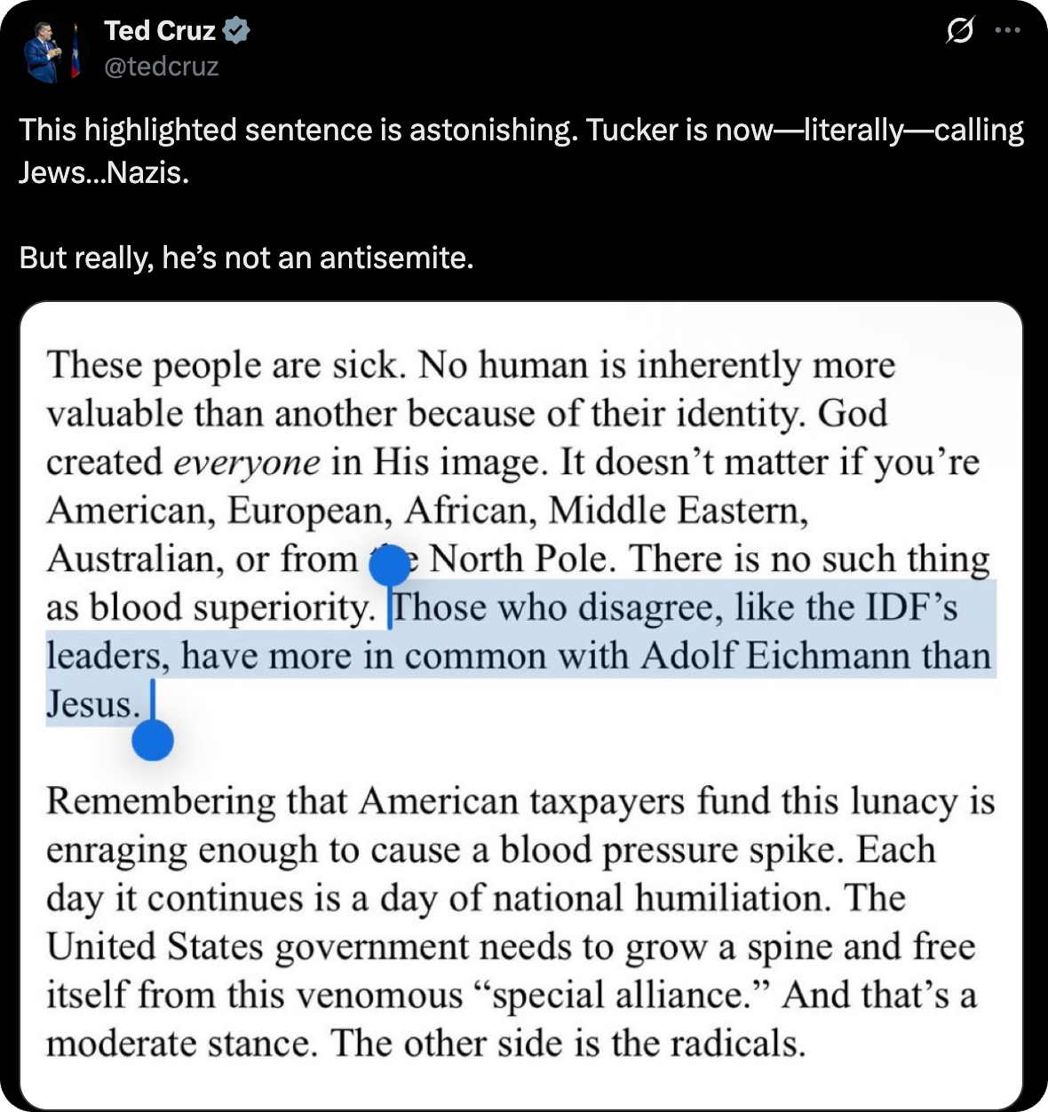 According to Ted Cruz and the ghouls in his creepy identitarian caucus, our takeaway equated to antisemitism. Check out what he tweeted about the Morning Note below.