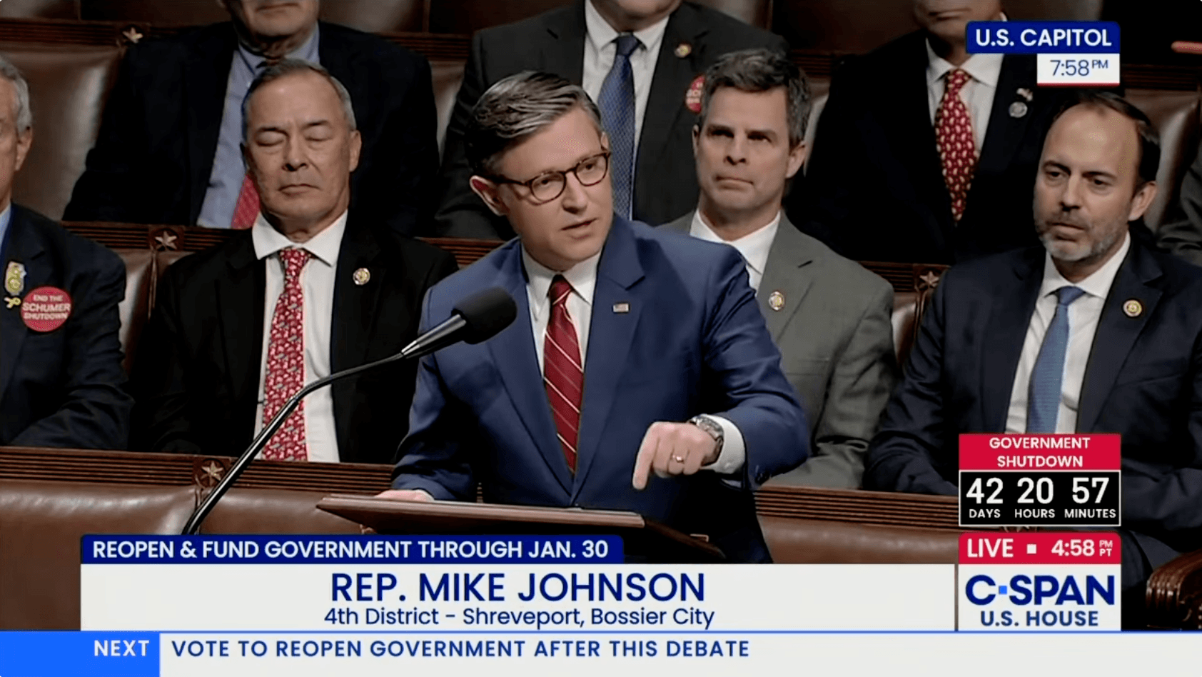 The Democrat Shutdown is Over | After 43 long days, the Democrat Shutdown is finally over. Democrats in the House and Senate forced the longest government shutdown in American history – and it was all for nothing. On Wednesday night, after House Republicans passed a funding bill to reopen the government, Speaker Johnson said, “Now that Republicans have succeeded in ending the Democrat Shutdown, we look forward to continuing our important legislative work delivering results for the American people.” Click here for Speaker Johnson and House Republican Leadership's statement following House passage of the bill, and click the image below to watch Speaker Johnson's floor speech prior to the House vote. | Following House passage, Speaker Johnson joined President Donald J. Trump and other House Republicans in the Oval Office as he signed the bill and reopened the government, ending the longest government shutdown in American history. | On Veterans Day, Speaker Johnson joined President Trump and Vice President Vance at Arlington National Cemetery for a Veterans Day ceremony. Speaker Johnson’s staff members were all across Louisiana's Fourth Congressional District at ceremonies to honor America’s veterans and thank them for their service. See more below. | Office of Speaker Mike Johnson | Sign up for our newsletter to get updates from Washington! | Bossier City 2250 Hospital Drive Suite 248 Bossier City, LA 71111 (318) 840-0309 | Washington, DC 521 Cannon House Office Building Washington, DC 20515 (202) 225-2777 | DeRidder Mailing: P.O. Box 160 DeRidder, LA 70634 (337) 226-6385 | Northwestern State University - Ft. Polk Mailing: P.O. Box 779 Leesville, LA 71446 (337) 423-4232 | Ruston 401 N. Trenton St. Ruston, LA 712070 (318) 497-6610 | |