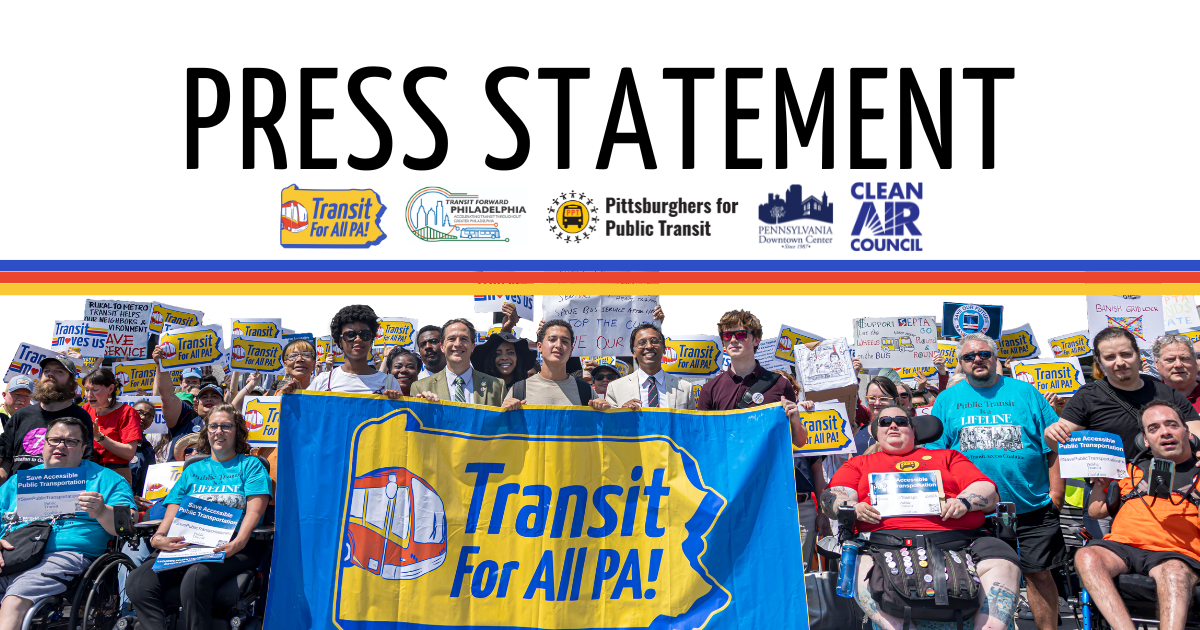 Image Description: text reads "press statement" with logos of Transit for All PA! coalition and photo of transit advocates smiling and holding signs. |
