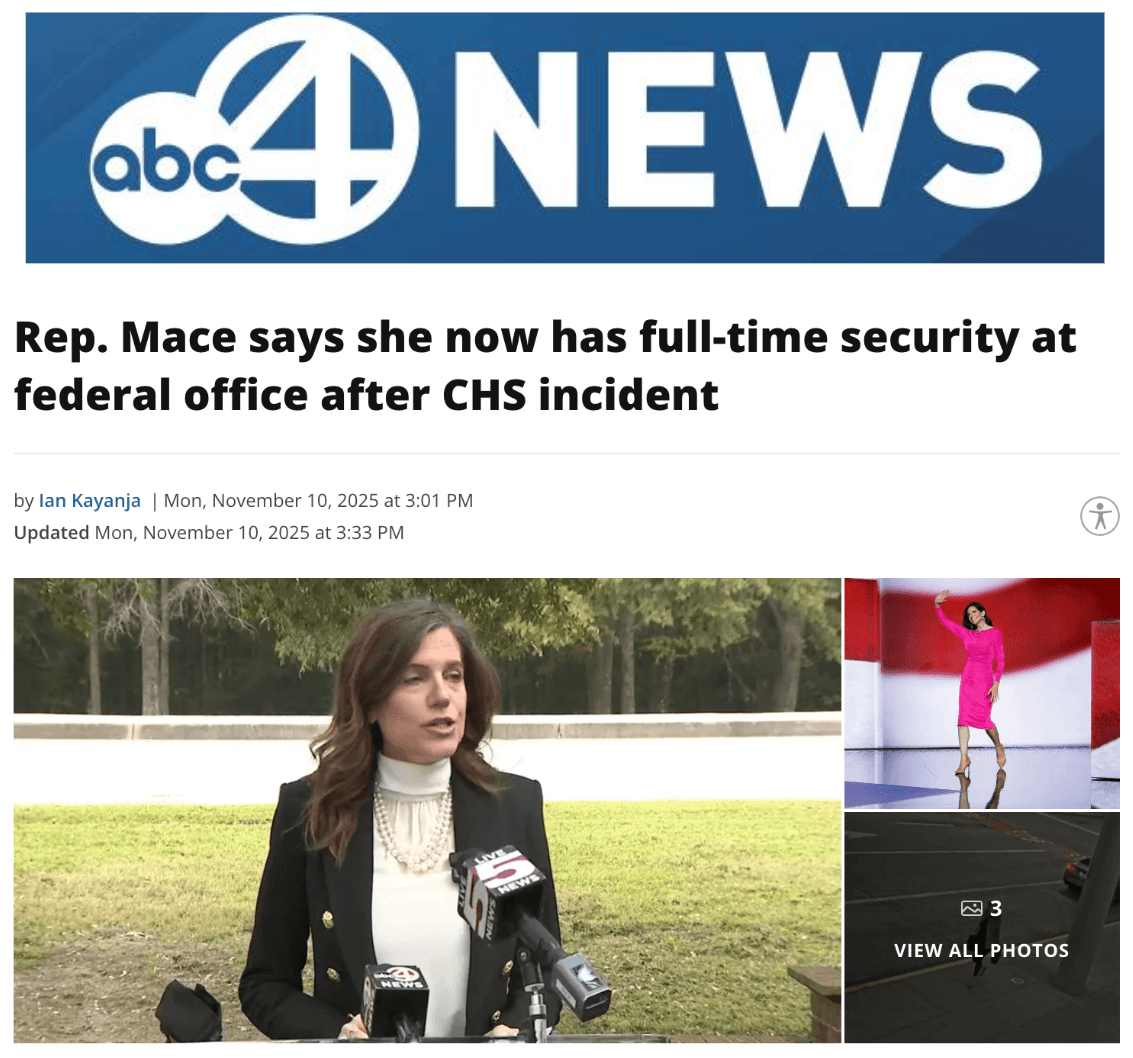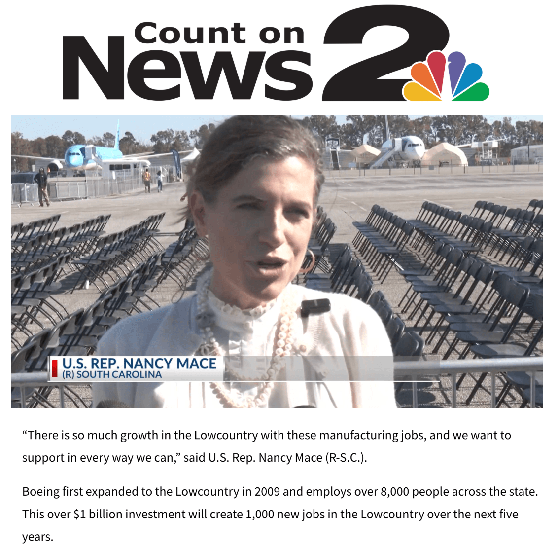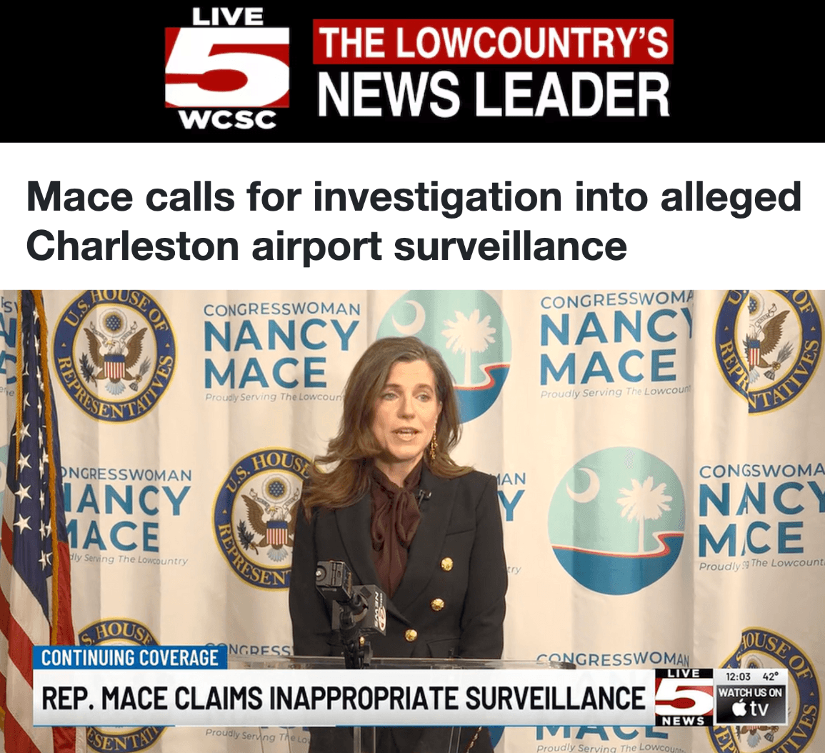Separately, current and former airport employees were allegedly punished or retaliated against for speaking out about other alleged security issues, breaches, and abuses. "This appears to be yet another example of the weaponization of government agencies against a conservative," said Rep. Mace. "If these allegations are true, it represents a disturbing abuse of power and a clear case of political retaliation. No American - let alone a sitting Member of Congress - should be subjected to this kind of targeted harassment simply for doing their job and standing up for their constituents. But this isn’t just about me, I am also deeply concerned about the alleged targeting of airport employees who speak up and are retaliated against." Rep. Mace is calling on any current or former TSA employees, airport security personnel, airport employees, or other individuals with knowledge of this alleged targeting - or similar incidents - to come forward with information. Whistleblowers may contact Rep. Mace's office through the following secure channel: mace.house.gov/contact "I want to assure any potential whistleblowers that your information will be handled with the utmost confidentiality and seriousness," Rep. Mace continued. "People deserve to know if their government is abusing its authority to target political opponents and private citizens." Rep. Mace indicated she will refer this matter to all appropriate federal and state oversight committees and inspectors general for investigation. Rep. Mace will also be contacting law enforcement agencies about any potential laws that may have been broken and will pursue this to the fullest extent of the law. | We spoke with WCBD News 2 at the groundbreaking of Boeing South Carolina’s $1 billion expansion. This project is a major win for our state and for American manufacturing. More than 1,000 new jobs are coming to the Lowcountry as Boeing continues to grow and produce the best in the world right here at home. | ABC News 4 covered our new full-time security detail at the Charleston office following the recent airport incident. It apparently took an airport falsifying police reports and retaliating against a Member of Congress to wake everyone up to the reality of the threats we face every day. The men and women of the Charleston Police Department and the U.S. Capitol Police put their lives on the line daily to protect both public servants and citizens. Their professionalism stands in stark contrast to the misconduct we witnessed from one or two bad actors at the Charleston Airport. | We held a press conference this week calling on additional whistleblowers to come forward after receiving credible information Rep. Mace was allegedly subjected to inappropriate surveillance and targeting by the Transportation Security Administration (TSA) and Charleston International Airport security personnel (CHS). We’re urging any current or former TSA employees, airport security personnel, airport employees, or other individuals with knowledge of this alleged targeting - or similar incidents - to come forward with information. Whistleblowers may contact Rep. Mace's office through the following secure channel: mace.house.gov/contact | We spoke with reporters on Capitol Hill about why we’re not removing our name from the Epstein discharge petition. We called out the fake news for trying to turn this into a story about President Trump instead of focusing on Epstein’s victims. Too many survivors never see justice, which is why we continue to stand with ALL survivors and will not abandon them.  Watch the full interview HERE. | 💬 Need help with a federal agency? Contact our district office: 📞 (843) 352-7572 |📍 900 Island Park Drive Suite 260, Daniel Island, SC 29492 | Constituent Spotlights: Constance Martin-Witter and Stacey Lindbergh | This week, we’re highlighting two outstanding community leaders!  Constance Martin-Witter is the Executive Director of the Bluffton Community Kitchen. Founded in 2011 by her mother, Ida Martin, the Bluffton Community Kitchen has become a lifeline for underserved families through its Hot Meals Program, Outdoor Food Pantry, 24-Hour Food Tree, and Afterschool Enrichment Program. The organization has seen about a 20% increase in program usage since the government shutdown first started. We thank Constance for her unwavering dedication to serving the Bluffton community and supporting families when they need it most.  We're also highlighting Stacey Lindbergh, Director of Engagement at Palmetto Goodwill. She is leading an effort to refurbish laptops for people who lack reliable internet access, helping bridge the digital divide for families across the Lowcountry. | Rep. Nancy Mace Member of Congress | |