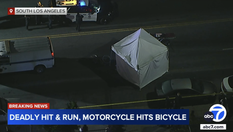 Los Angeles police are searching for a motorcyclist who killed a person on a bicycle in a hit-and-run crash. The deadly incident happened around 7 p.m Wednesday on Vernon Avenue near Avalon Boulevard in South L.A., according to the Los Angeles Police Department. Investigators say the motorcycle rider slammed into a bicyclist and then took off. The victim, who has not been identified, was pronounced dead at the scene. Police spent the night looking through surveillance video and talking to witnesses in the hopes of tracking down the rider responsible.