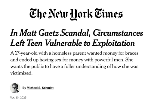 Yesterday we got to hear the girl’s side of the story via a New York Times expose. The story describes how at the time she met Gaetz she was living at a homeless shelter and needed the money to save up for braces to fix her teeth. It’s just so dark.