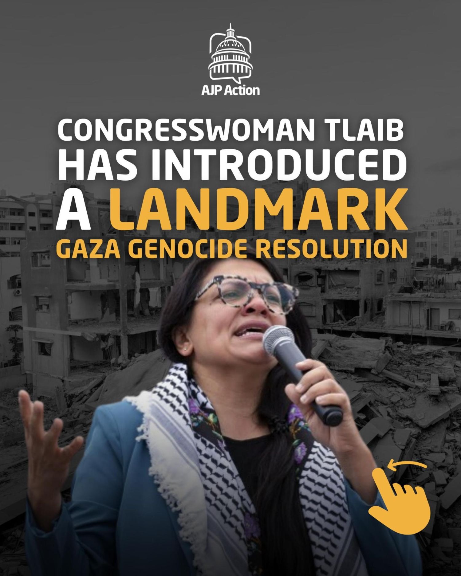 Congresswoman Tlaib’s genocide resolution forces the U.S. to confront its role in genocide and demands immediate action and accountability Dear Email, AJP Action is proud to endorse Congresswoman Rashida Tlaib’s historic resolution, H.Res. 876, which does what our government has shamefully refused to do: formally recognize the Israeli state’s deliberate and systematic destruction of the Palestinian people in Gaza for what it is. This is not a matter of opinion or political debate. It is a legal and moral fact. The evidence is overwhelming and undeniable: the mass killing of at least 68,000 Palestinians (this number is a conservative estimate) in less than two years, the calculated obliteration of every university and hospital, the weaponization of starvation and manufacturing famine, and the explicit statements of intent by Israeli officials to erase Gaza from existence. This resolution forces Congress to look directly at the monstrous reality it has funded and armed. “At this very moment, as Israel continues its atrocities under the cover of a false ceasefire, the need for this resolution is more critical than ever. For years, our tax dollars have funded this genocide, and our government's unwavering political and financial endorsement has enabled it. This resolution obliterates any pretense of neutrality. It is a line in the sand. To every member of Congress: you are either with the victims of this slaughter, or you are with the perpetrators. There is no middle ground. History will not forget your vote. History will not forgive your cowardice. The Palestinian people deserve more than our thoughts and prayers; they deserve our immediate and total action to end this nightmare,” said Dr. Osama Abu Irshaid, AJP Action’s Executive Director. H.Res. 876 does more than just document Israel's atrocities; it forces a reckoning. It demands that the U.S. government stop being complicit and start honoring the Genocide Convention. This means taking concrete, immediate action such as: - An immediate arms embargo: Halting all weapons transfers to Israel.