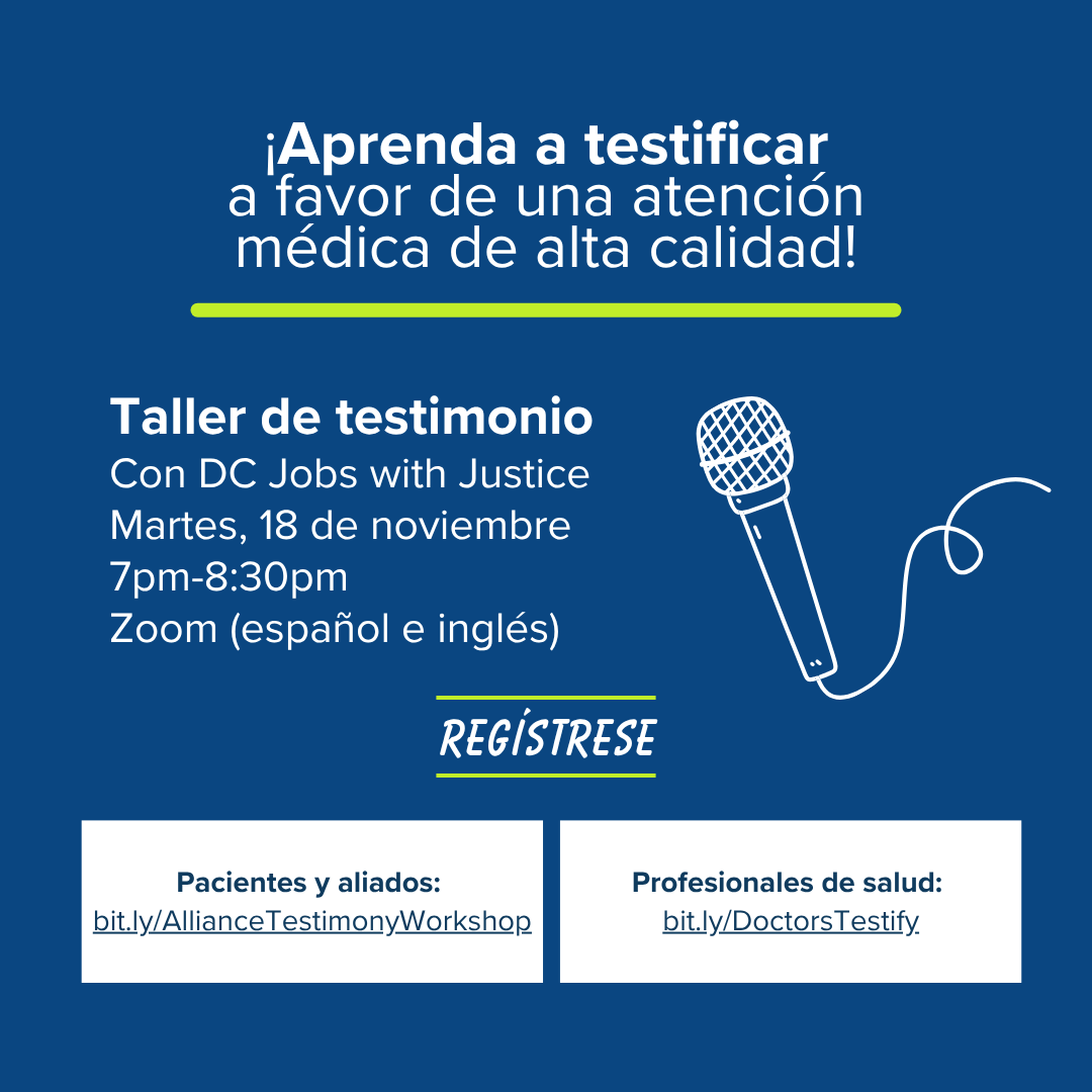 Para ayudarle a preparar su testimonio, puede asistir a un taller el martes 18 de noviembre de 7:00 p. m. a 8:30 p. m. Estamos organizando un taller bilingüe para pacientes y aliados, y la Asociación de Estudiantes de Medicina Latinos de GW está organizando un taller específico para profesionales de la salud.